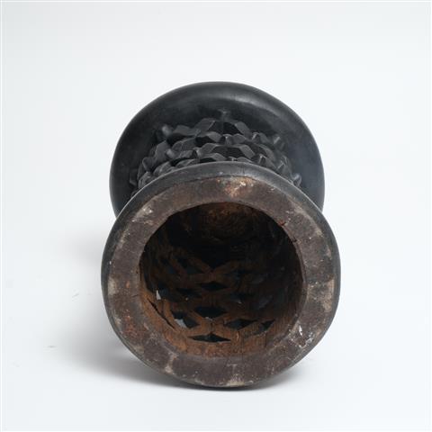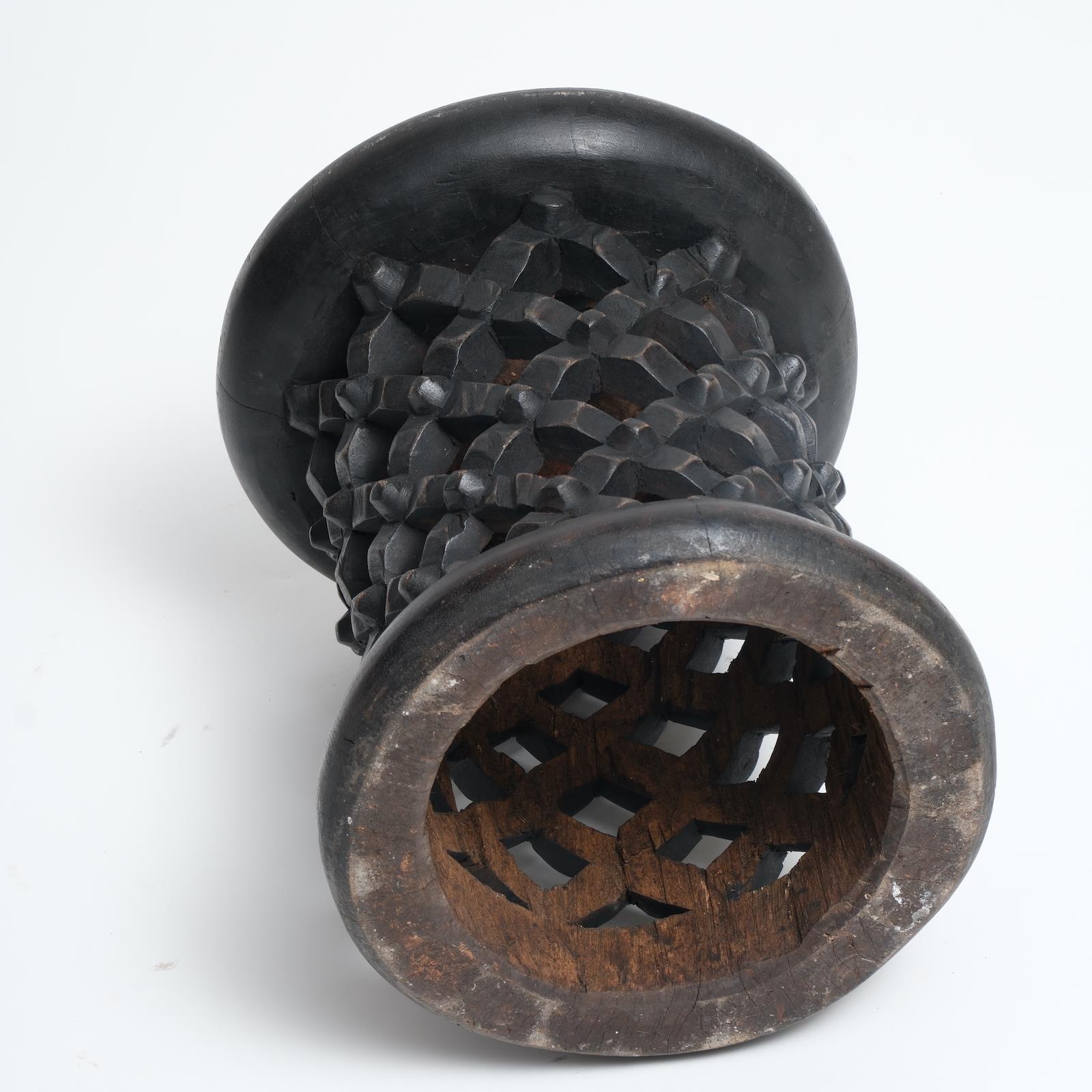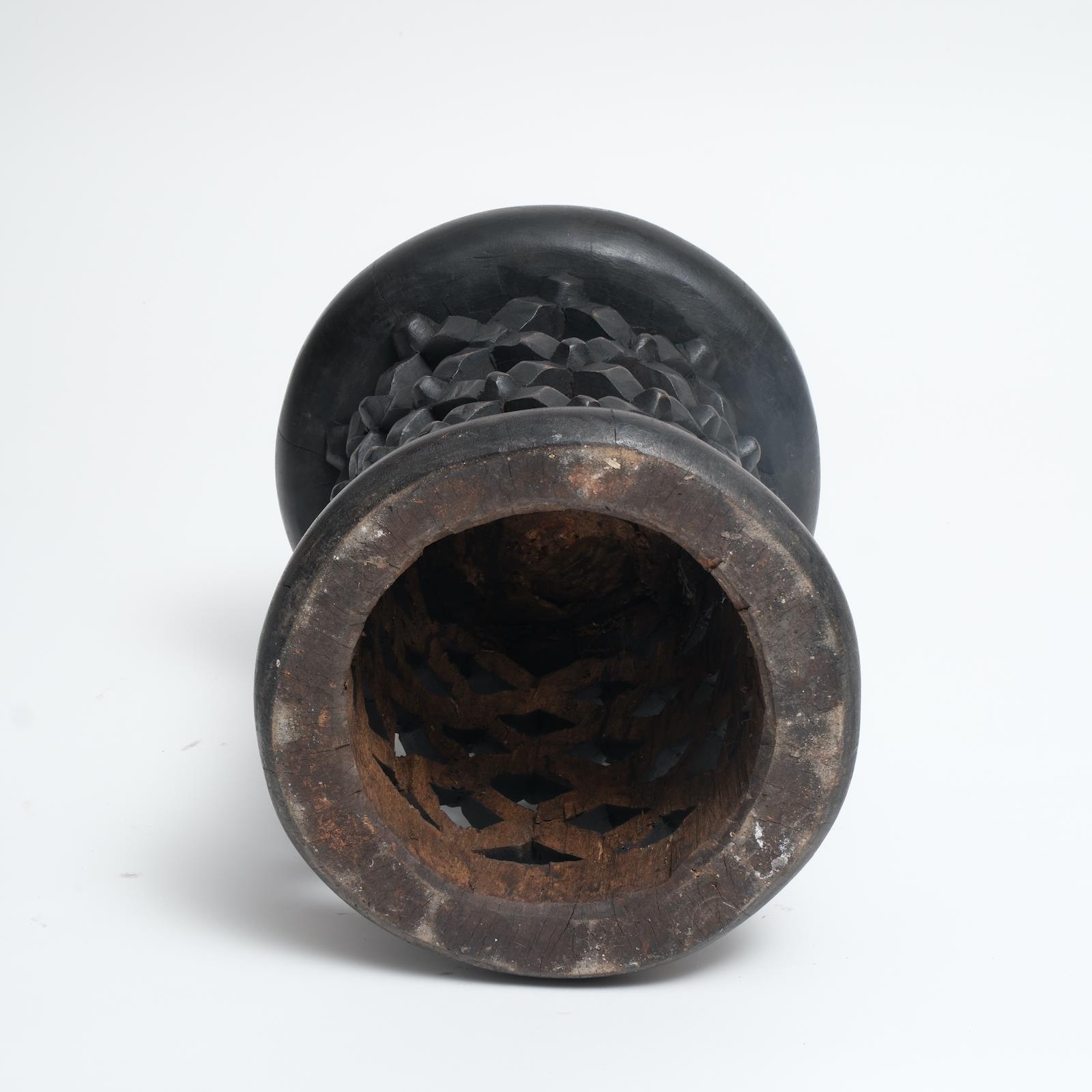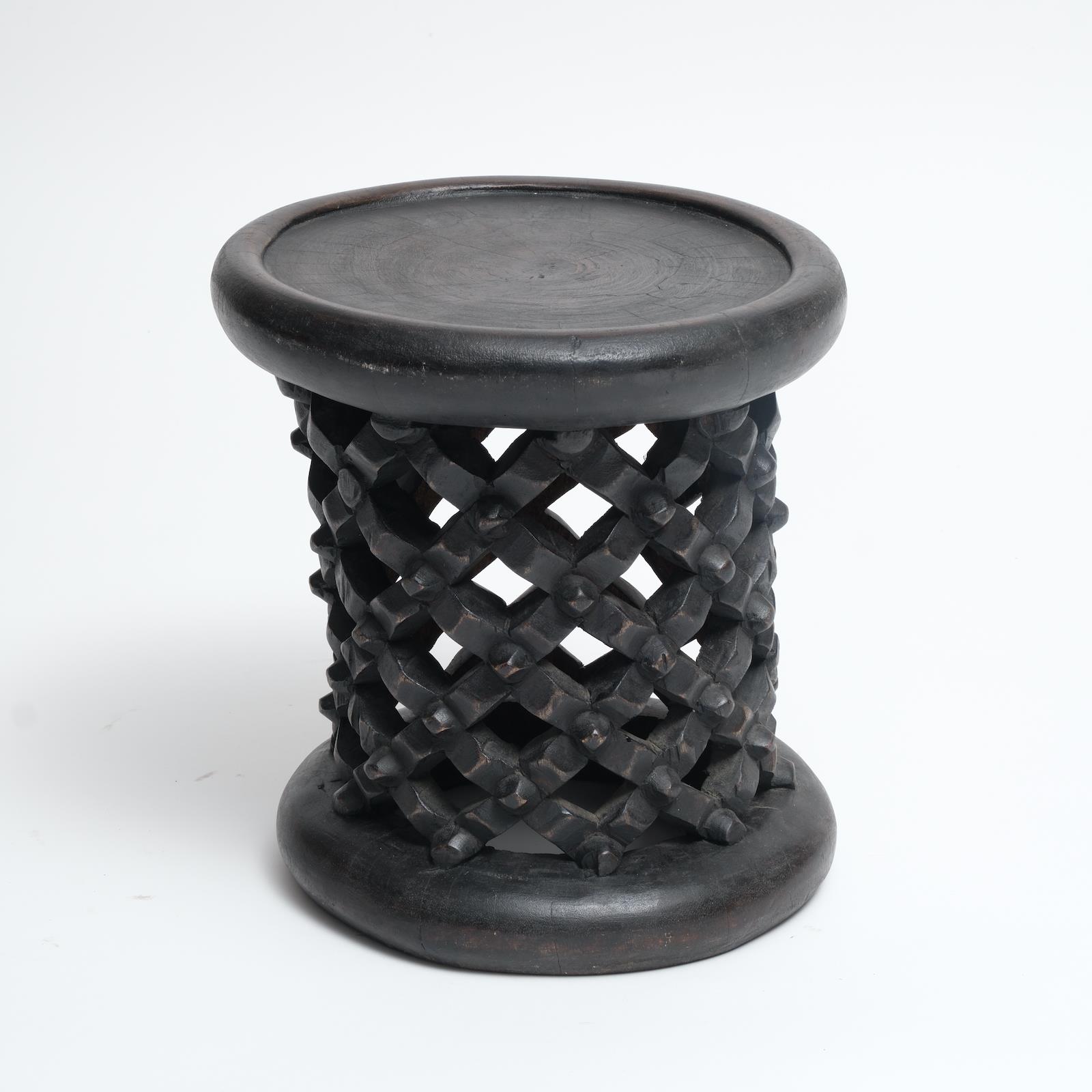 Batı Afrika’nın Bamileke kabilesi ustalarının el işçiliğiyle üretilmiş bu silindirik tabure, kabileye özgü geleneksel örgü desenlerini yansıtır. Masif ahşaptan tamamen elde oyulan gövde, hem estetik hem de kültürel bir değere sahiptir. Üst ve alt çerçevelerdeki koyu kahve detaylar, tasarıma güçlü bir kontrast katmaktadır. Fonksiyonel yapısıyla tabure ya da yan sehpa olarak kullanılabilen bu parça, yalnızca dekoratif bir obje değil; aynı zamanda Bamileke sanatının ve kültürünün bir temsilidir.