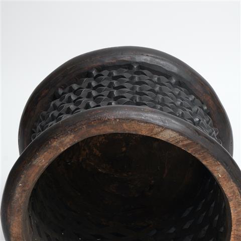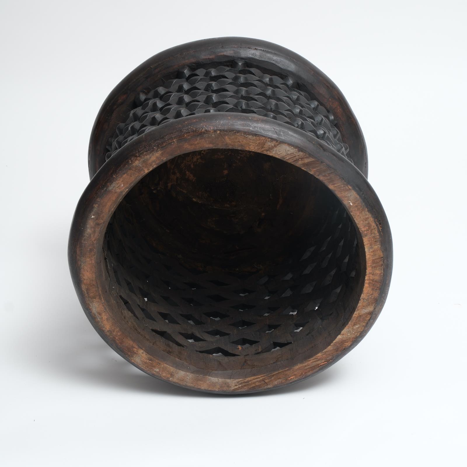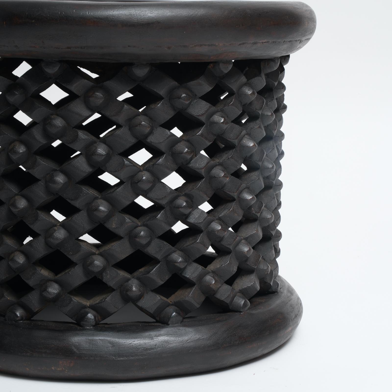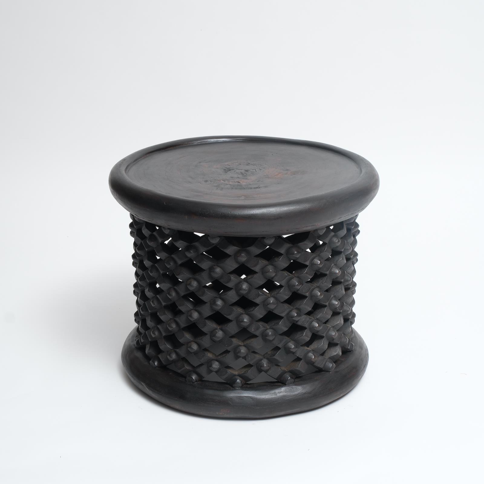 Batı Afrika’nın Bamileke kabilesi ustalarının el işçiliğiyle üretilmiş bu silindirik tabure, kabileye özgü geleneksel örgü desenlerini yansıtır. Masif ahşaptan tamamen elde oyulan gövde, hem estetik hem de kültürel bir değere sahiptir. Üst ve alt çerçevelerdeki koyu kahve detaylar, tasarıma güçlü bir kontrast katmaktadır.