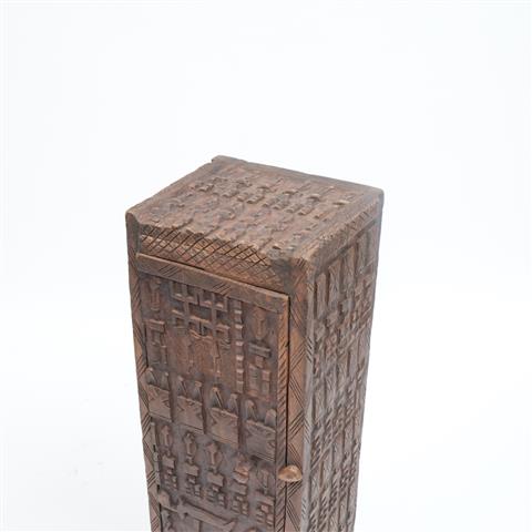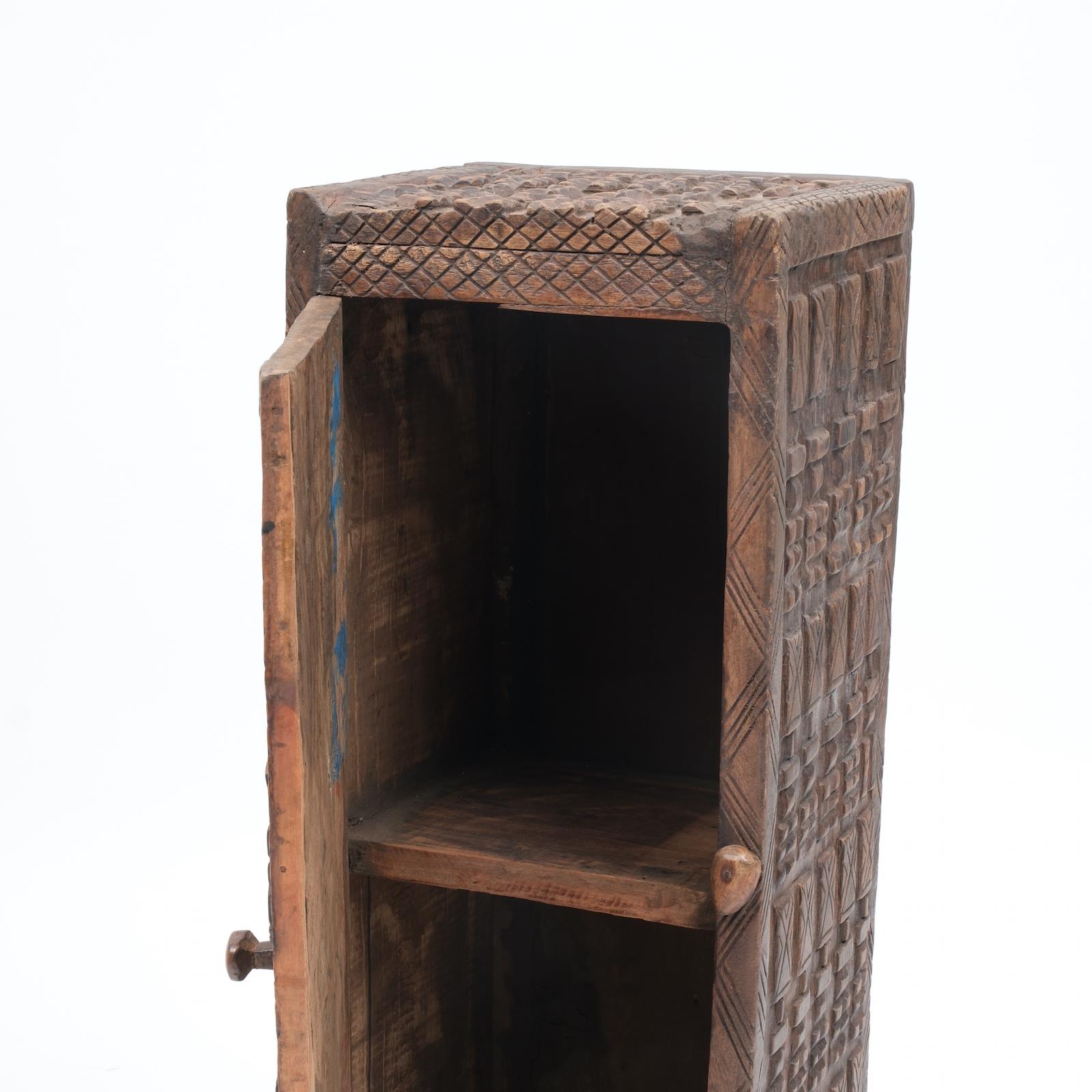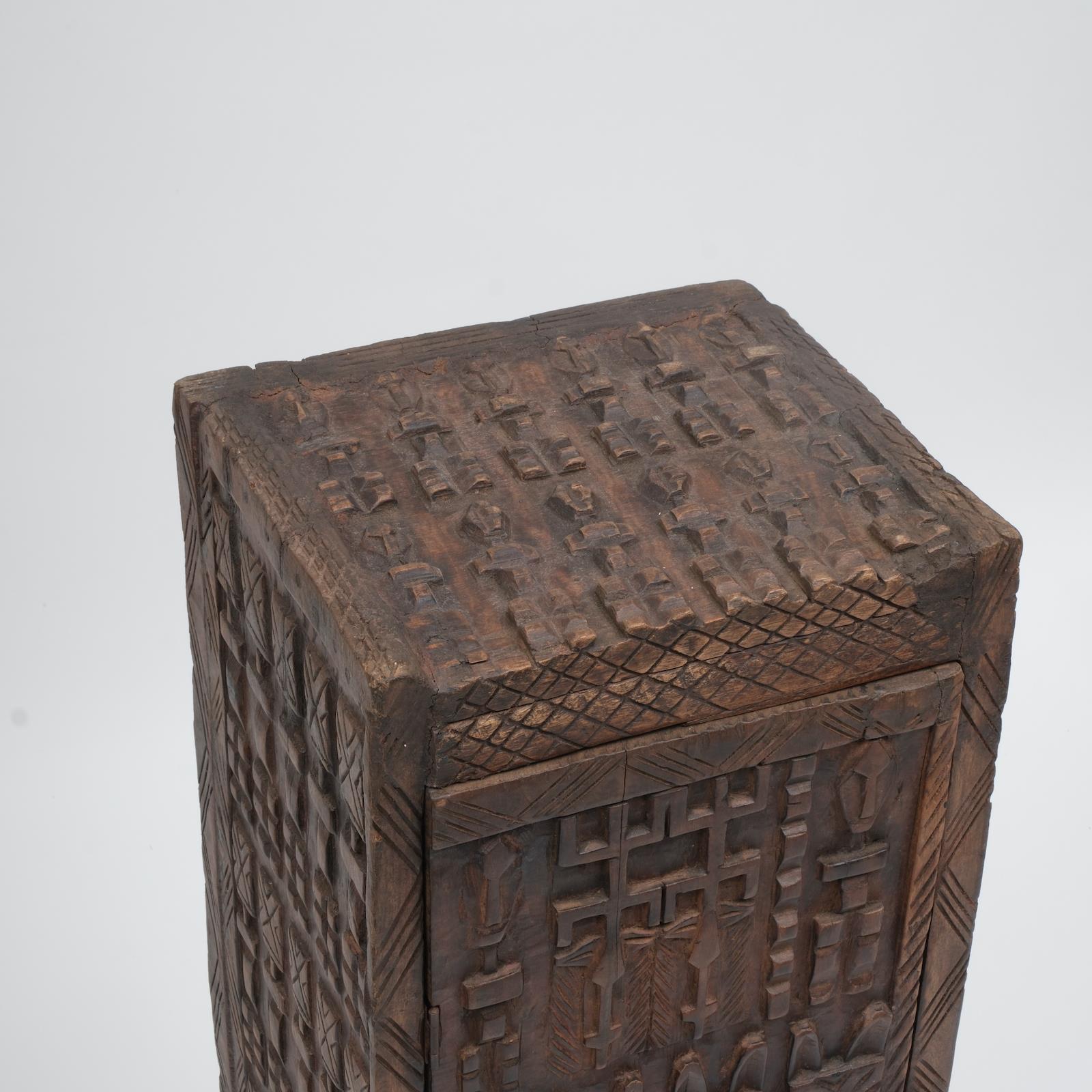 Batı Afrika’nın Mali bölgesinde yaşayan Dogon kabilesi ustalarının geleneğini yansıtan bu küçük boy dolap/pano, masif ahşaptan oyulmuştur. Üzerinde yer alan insan figürleri, geometrik desenler ve semboller, Dogon kültüründe toplumsal düzeni, bereketi ve atalarla bağlantıyı temsil eder. Dekoratif yönünün yanında koleksiyon değeri de taşıyan bu obje, mekânlara etnik bir derinlik katar.