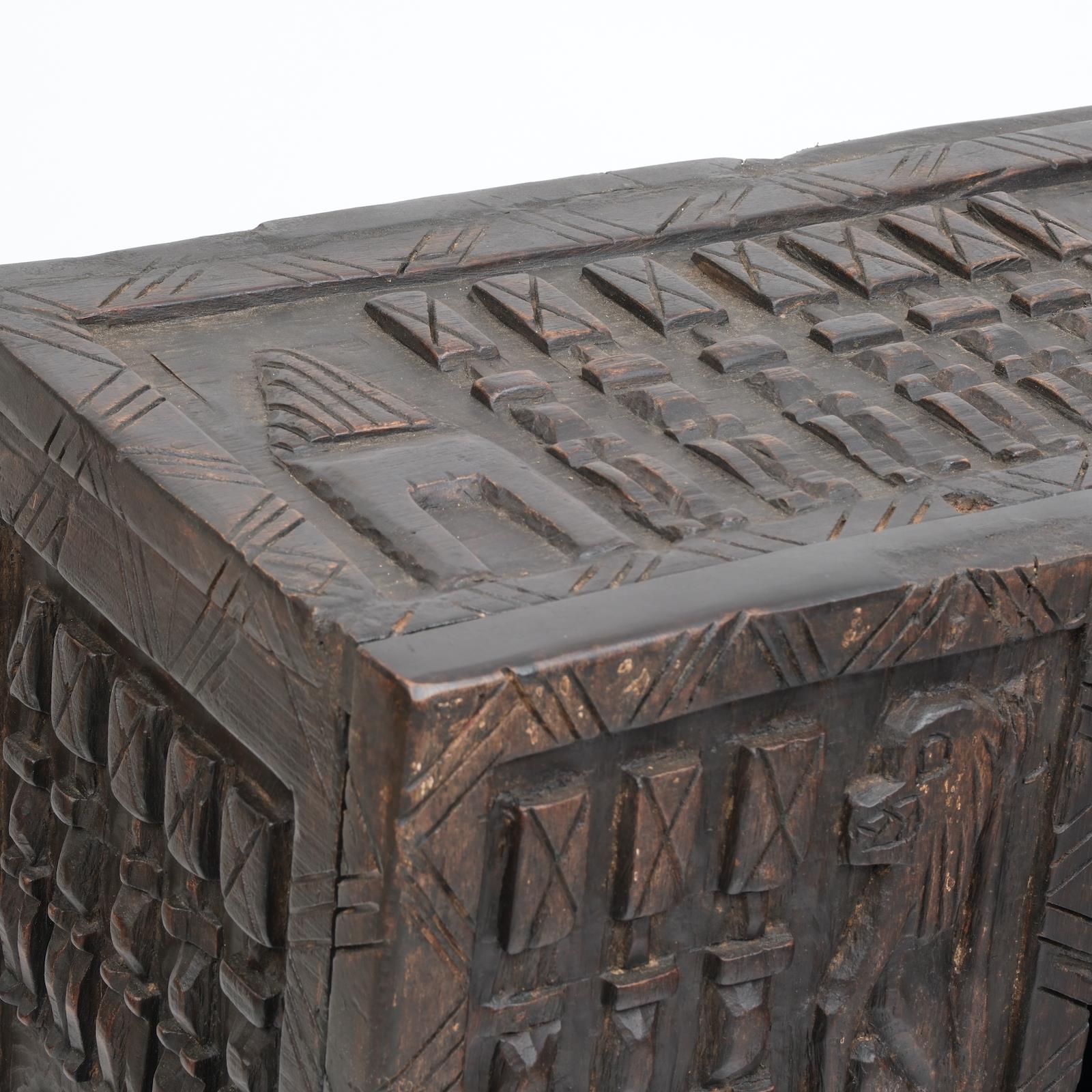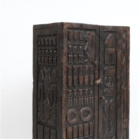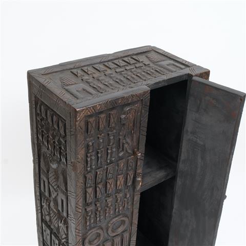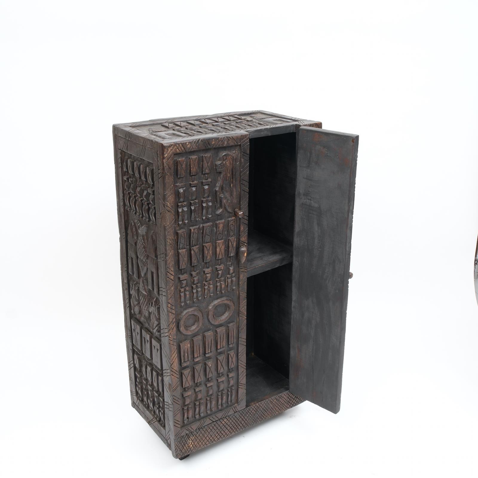 Masif ahşaptan oyularak yapılmış bu orta boy dolap, Batı Afrika’daki Dogon kabilesinin zengin sembolik dünyasını taşır. Üzerinde yer alan insan figürleri, geometrik desenler ve toplumsal sahneler, Dogonların yaşam felsefesini, atalara saygıyı ve doğayla uyumu simgeler. Geleneksel kapı formundan ilham alınarak üretilen bu parça, hem işlevsel hem de koleksiyonluk bir sanat objesidir.