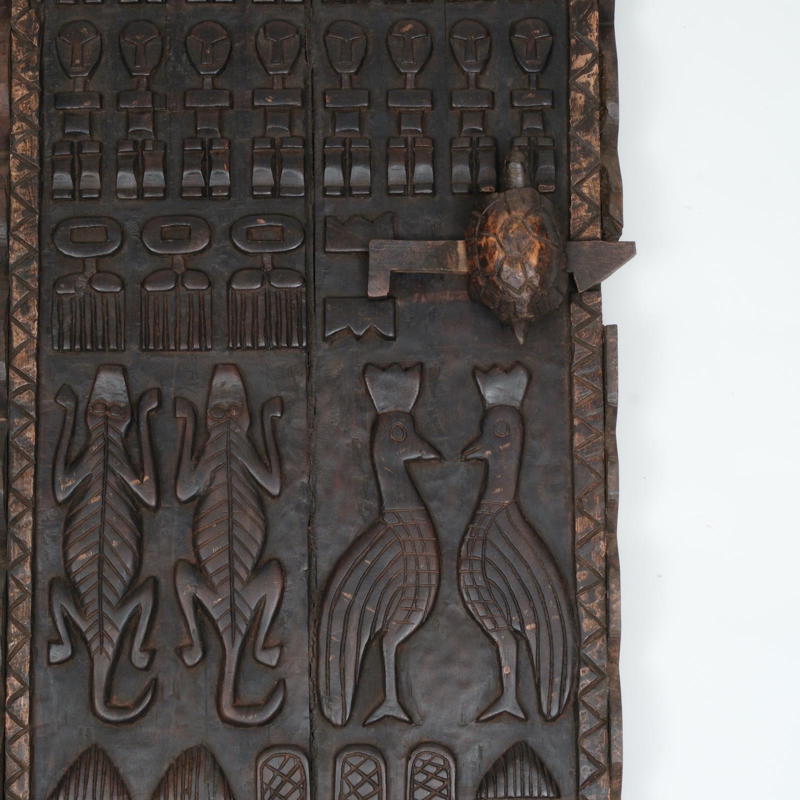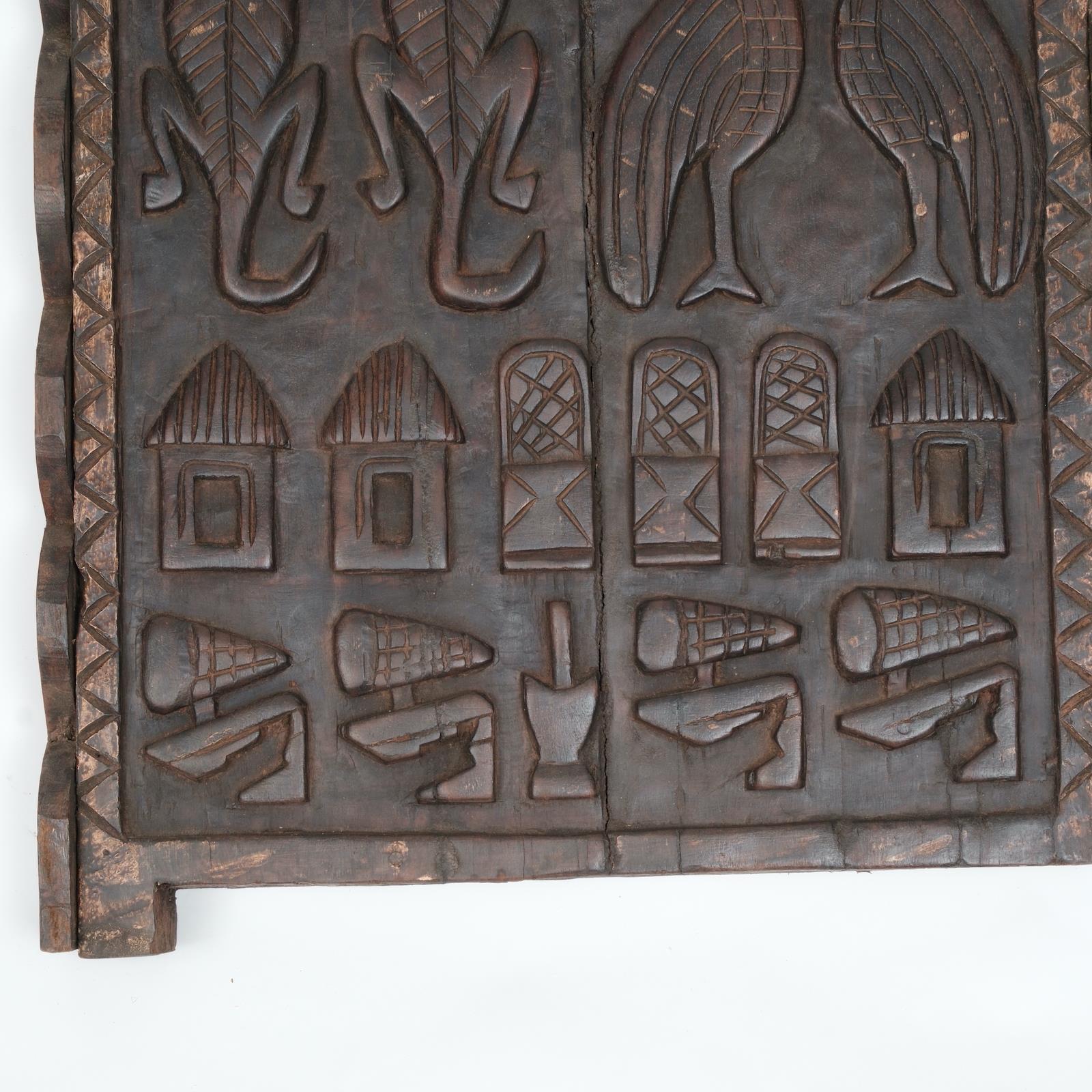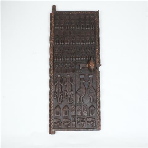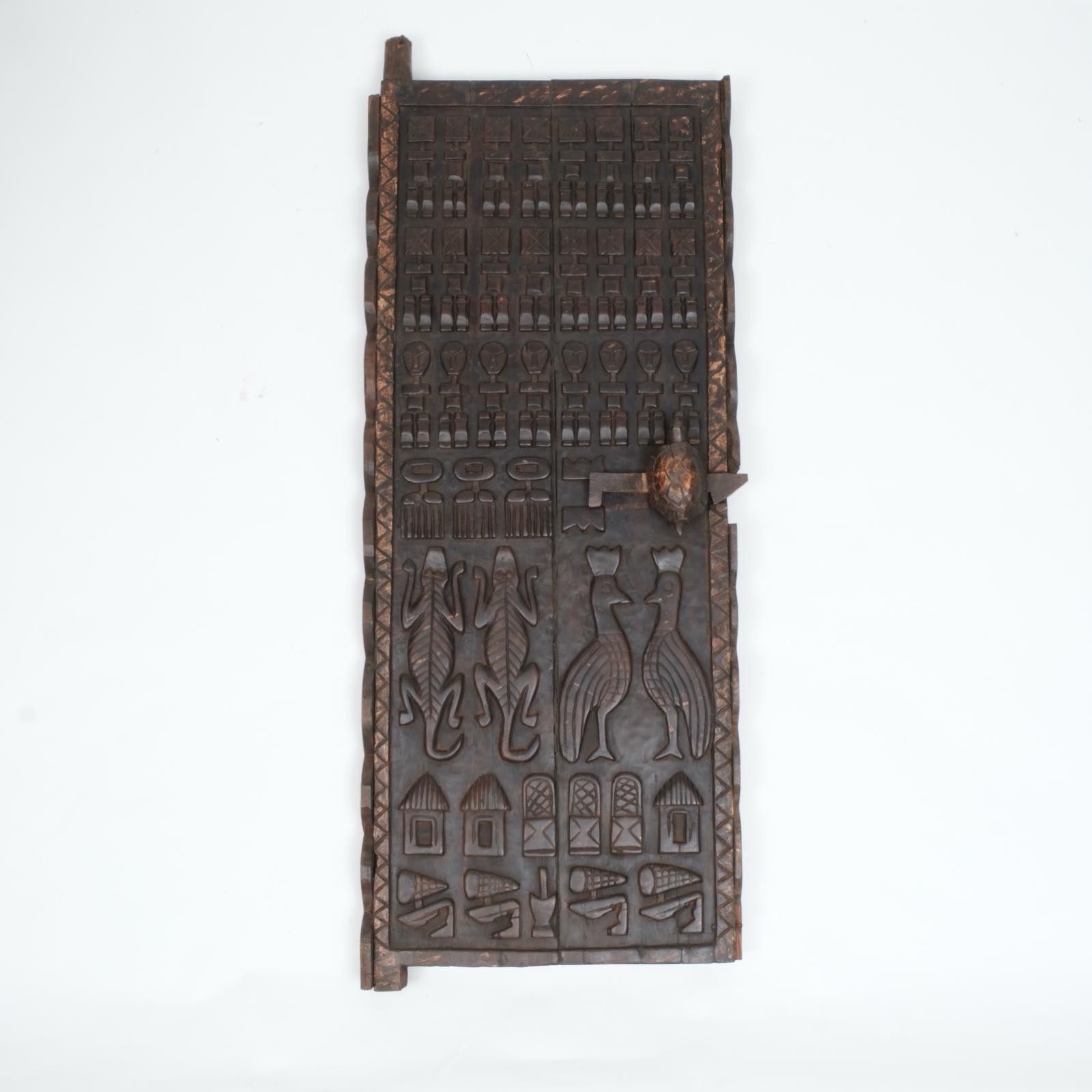 Batı Afrika’nın Mali bölgesinde yaşayan Dogon kabilesi ustalarının geleneğini yansıtan bu el yapımı kapı/pano, masif ahşaptan oyulmuştur. Yüzeyinde yer alan insan figürleri, geometrik semboller ve kabartmalar, Dogon halkının toplumsal düzenini, atalarla bağı ve doğa ile ilişkisini simgeler. Geleneksel olarak Dogon evlerinde depolama alanlarını veya kutsal mekânları korumak için kullanılan bu panolar, bugün koleksiyonluk sanat eserleri arasında değerli bir yere sahiptir.