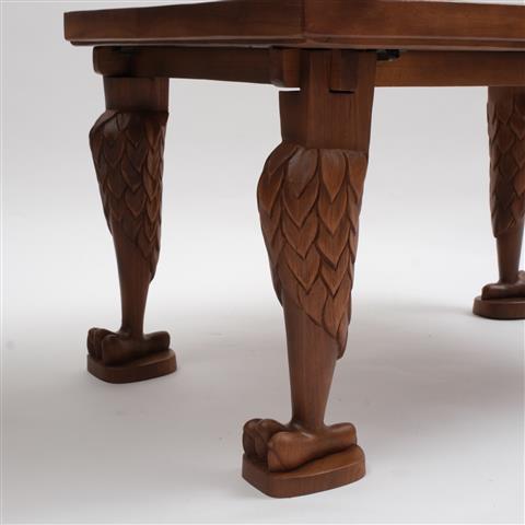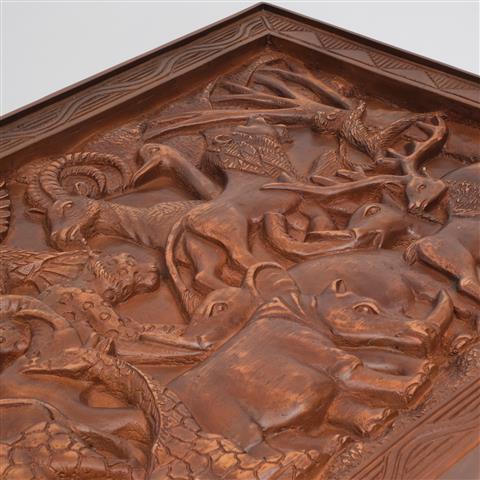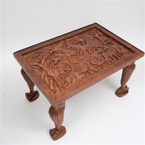 Üzerinde aynası ile teslim edilecektir. Doğu Afrika’nın usta oymacıları tarafından masif ahşaptan el işçiliğiyle üretilen bu masa, üst yüzeyindeki Afrika vahşi yaşamı sahnesi ile öne çıkar. Zürafa, gergedan, kuşlar ve antilop gibi hayvanların ayrıntılı kabartmaları doğanın tüm dinamizmini yansıtır. Kuş pençesi formunda oyulmuş ayaklarıyla hem heykelsi hem de fonksiyonel bir mobilya parçasıdır.