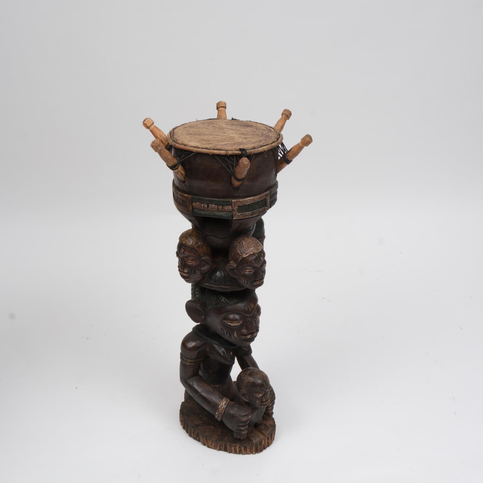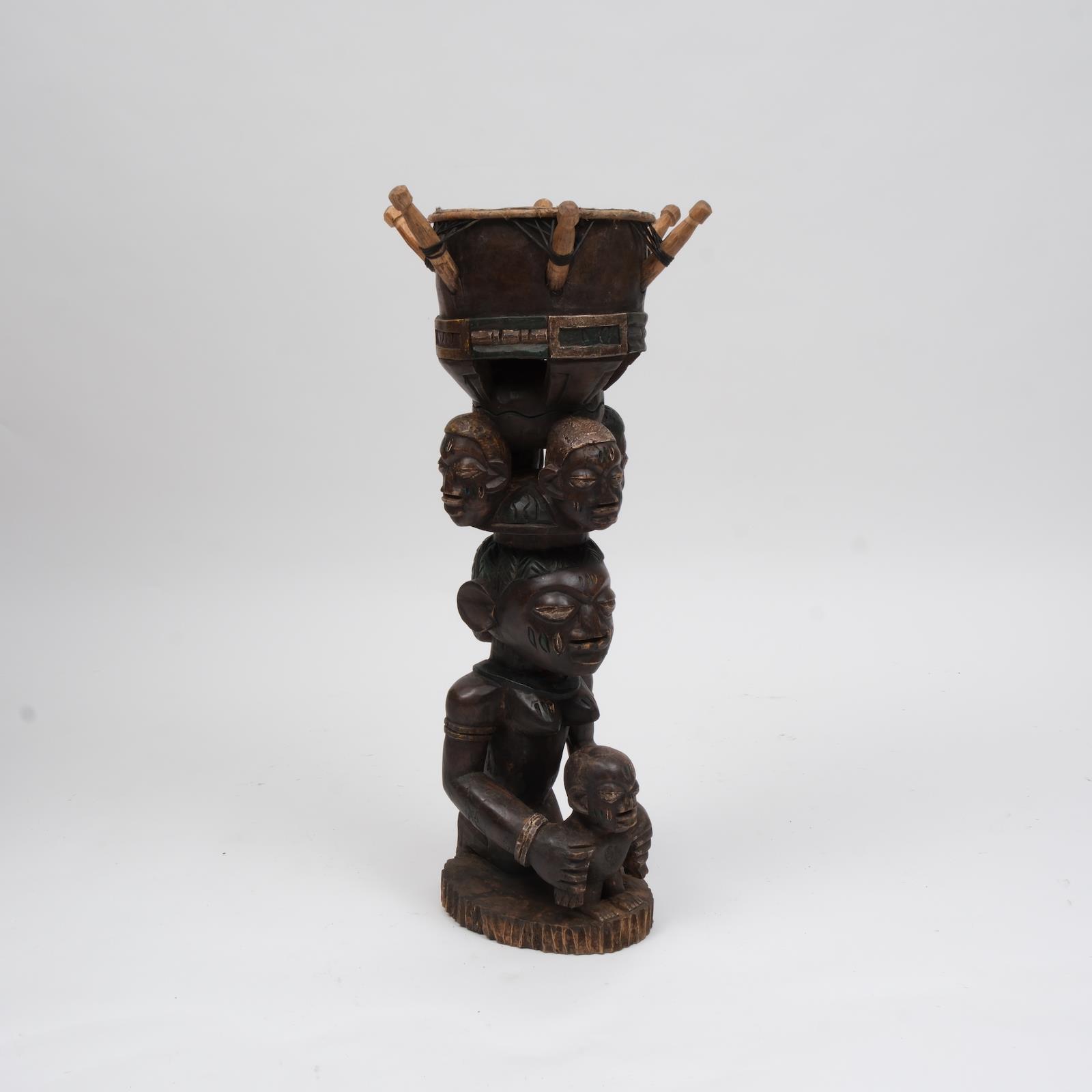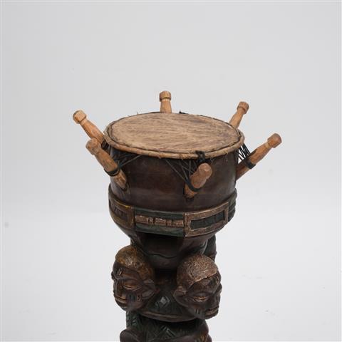 Batı Afrika’nın Yoruba kültüründen ilham alan bu özel ritüel davul, sadece bir müzik aleti değil aynı zamanda törensel ve sembolik bir objedir. Alt bölümde oyulmuş kadın figürü annelik, koruma ve bereketi temsil ederken, çevresini saran insan başları atalara ve topluluğun ruhani rehberlerine göndermede bulunur. Üst kısım deri gerilerek hazırlanmış ve işlevsel bir çalgı olarak da kullanılabilir.