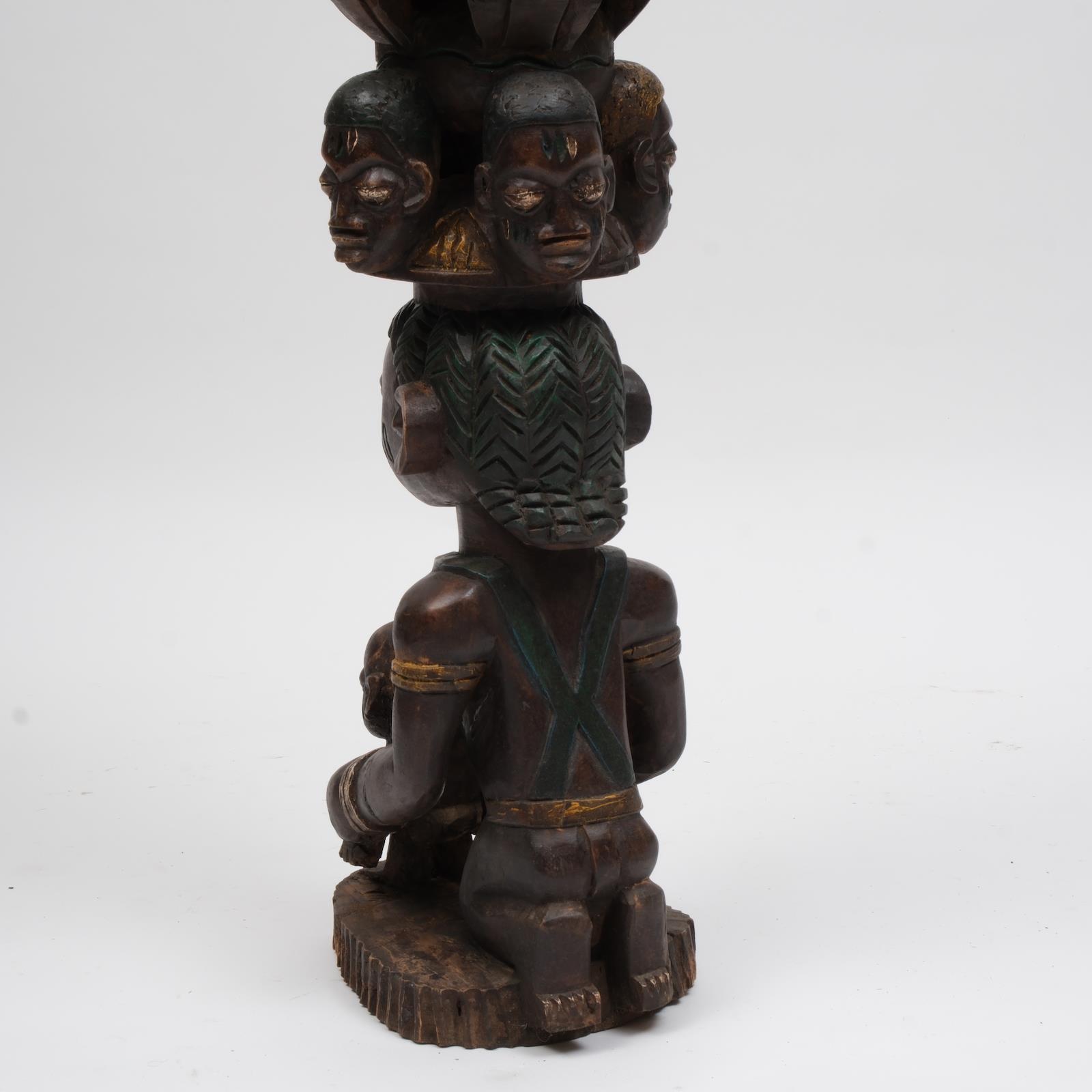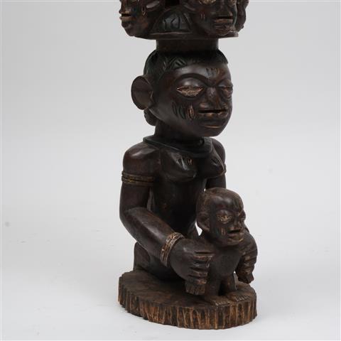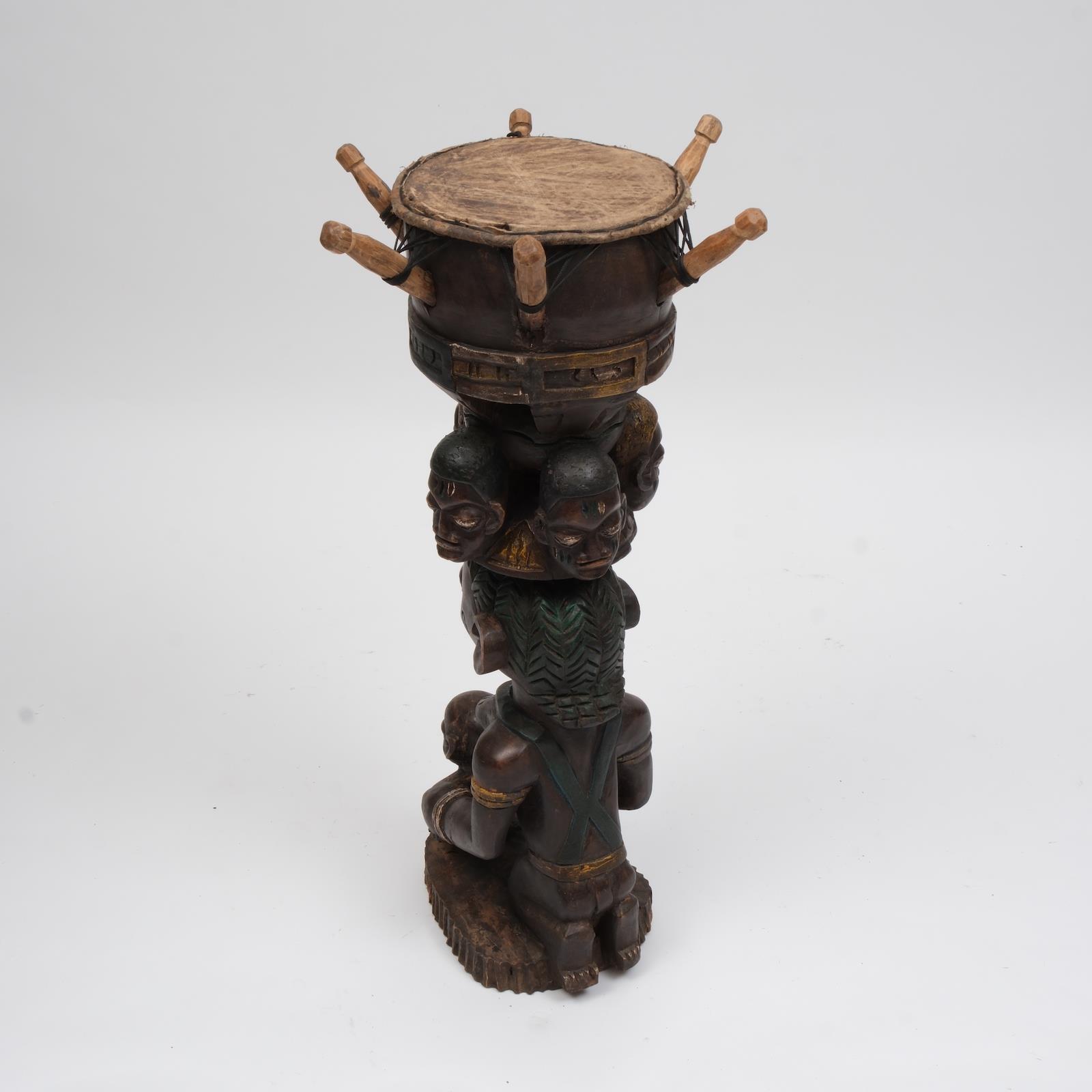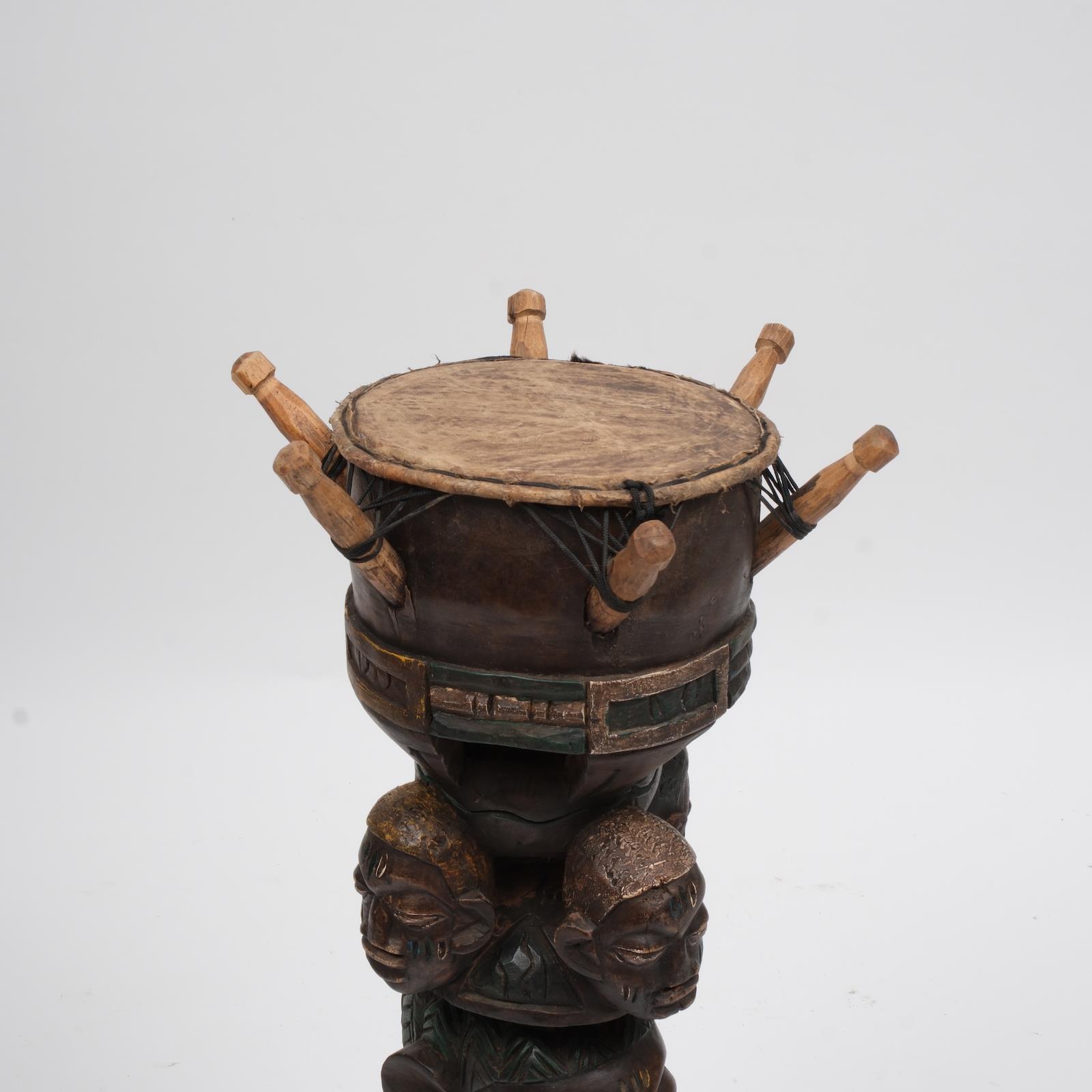 Batı Afrika’nın Yoruba kültüründen ilham alan bu özel ritüel davul, sadece bir müzik aleti değil aynı zamanda törensel ve sembolik bir objedir. Alt bölümde oyulmuş kadın figürü annelik, koruma ve bereketi temsil ederken, çevresini saran insan başları atalara ve topluluğun ruhani rehberlerine göndermede bulunur. Üst kısım deri gerilerek hazırlanmış ve işlevsel bir çalgı olarak da kullanılabilir.