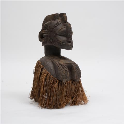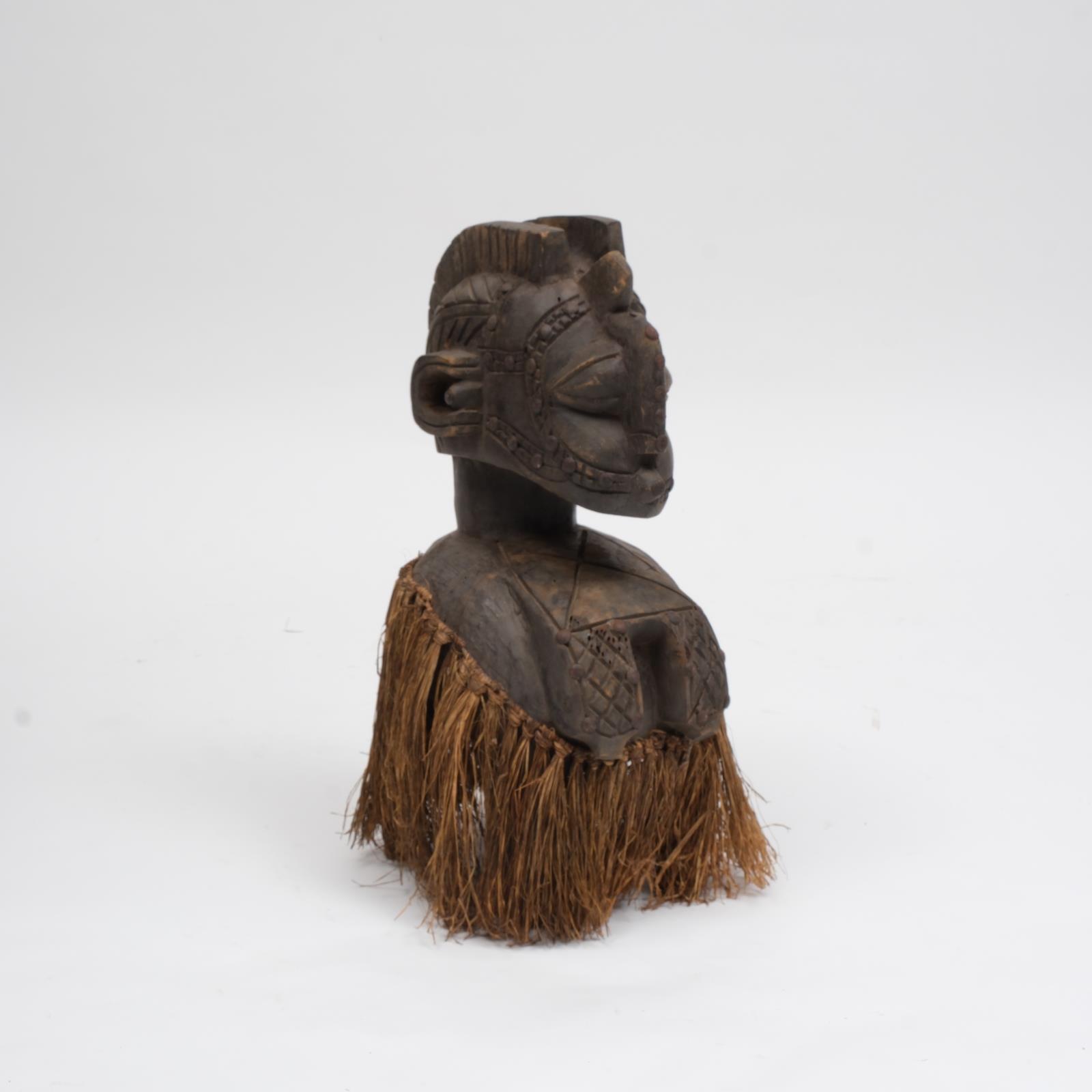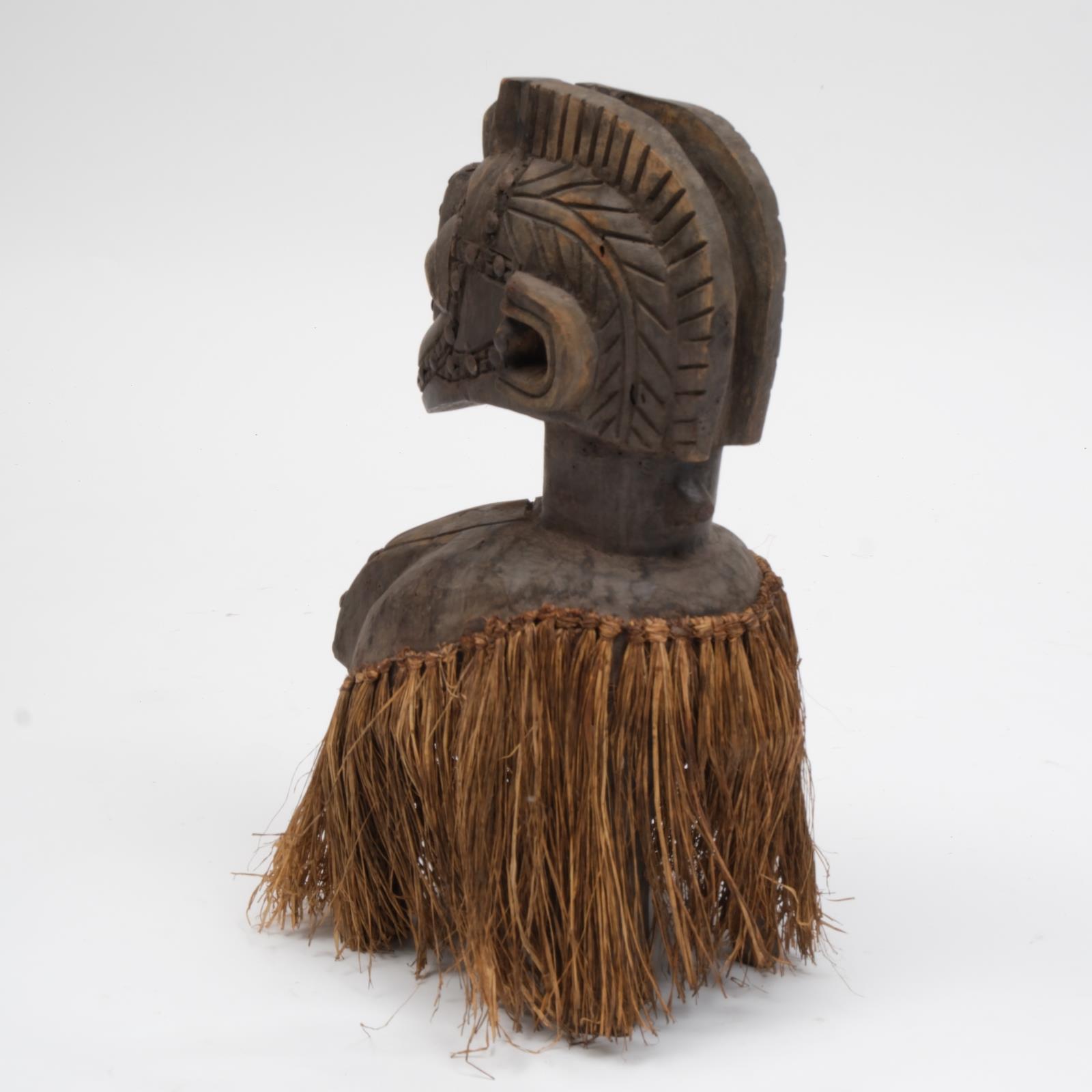 Batı Afrika kabile geleneğinden ilham alan bu ritüel büst, törensel maskelerin heykelsi yorumudur. Ahşap gövdeye oyulmuş yüz detayları, kabile kimliğini ve topluluğun ruhani hafızasını temsil ederken; alt kısmı süsleyen doğal rafya lifleri, dans ve ritüel hareketlerini çağrıştırır. Koleksiyon değeri yüksek, hem sanatsal hem kültürel bir objedir.