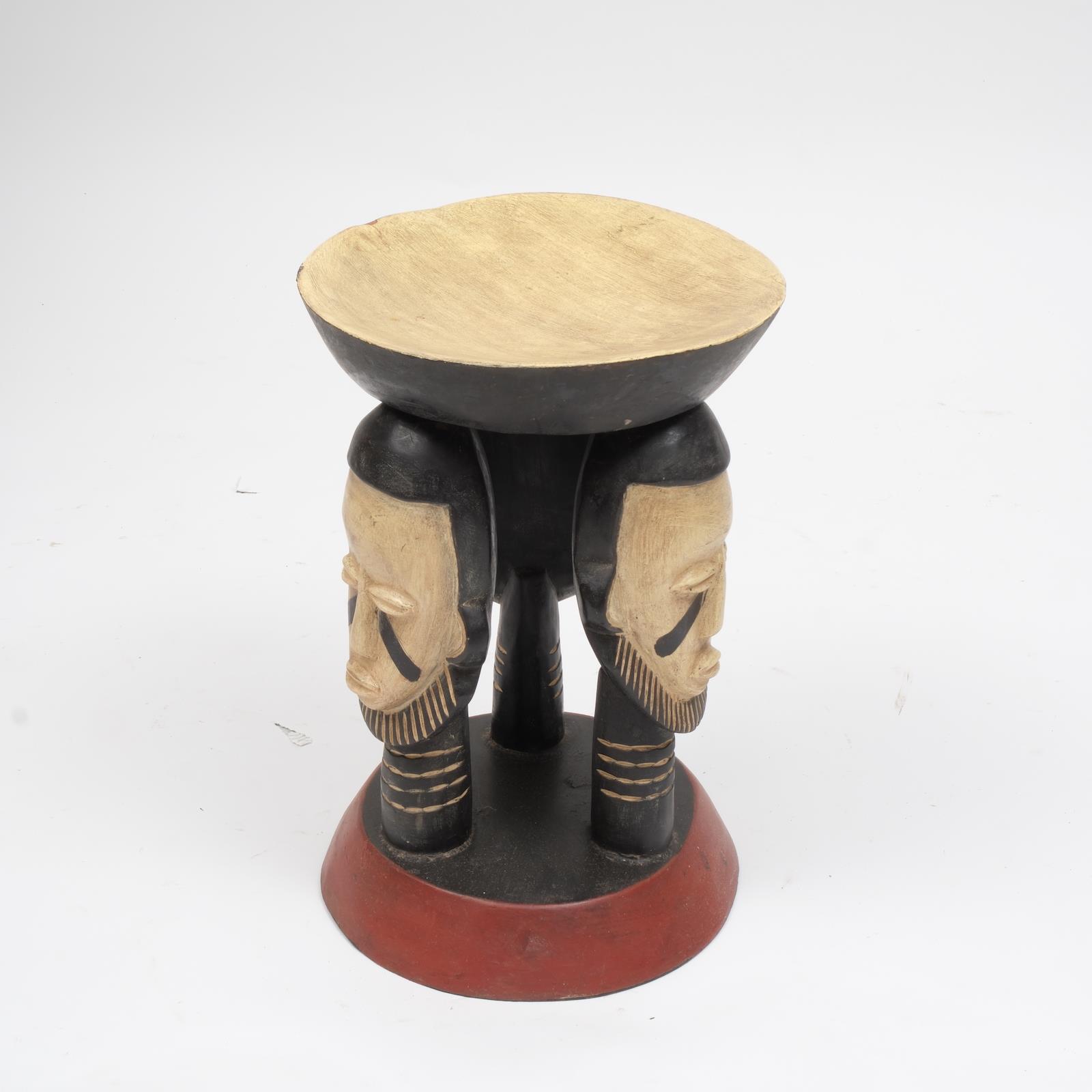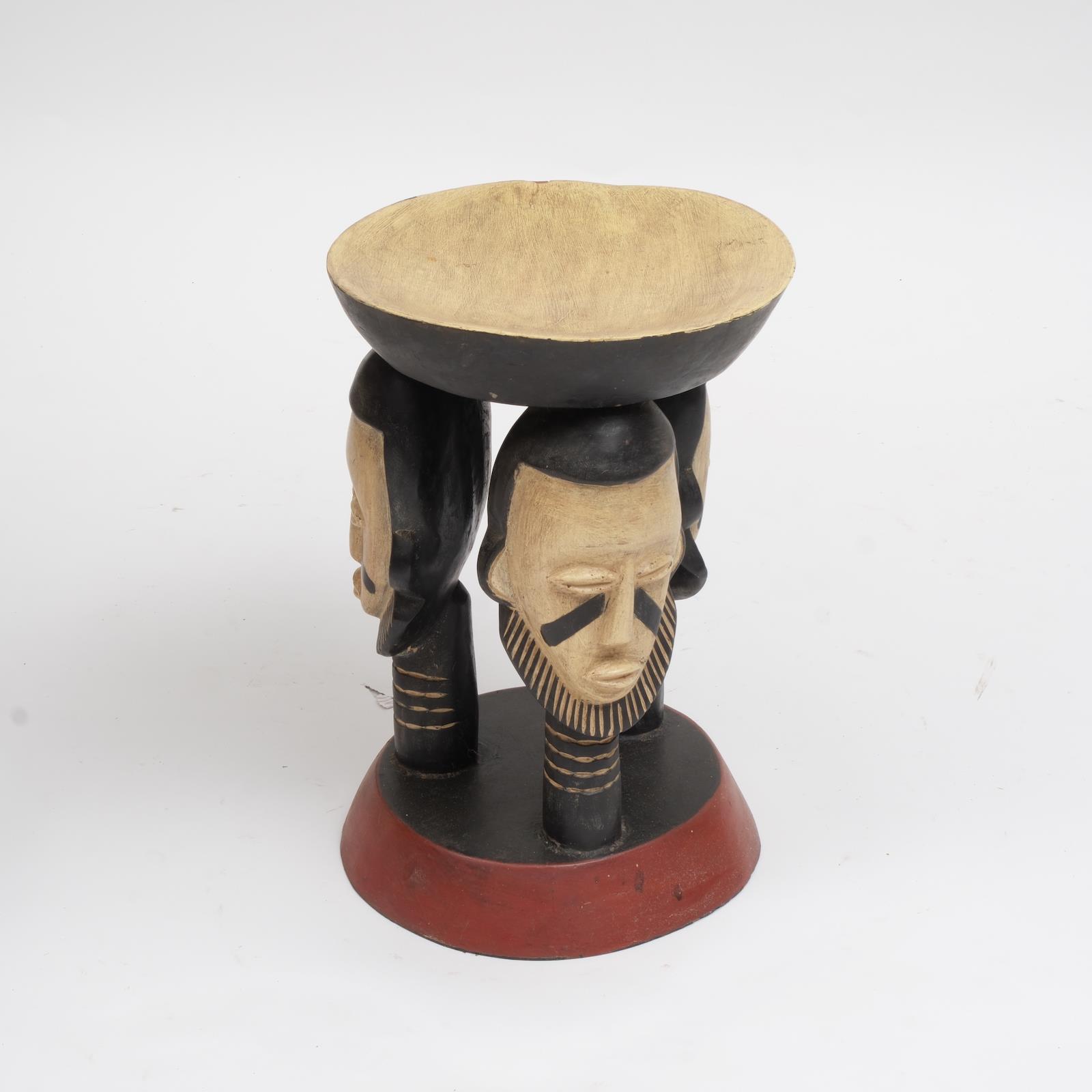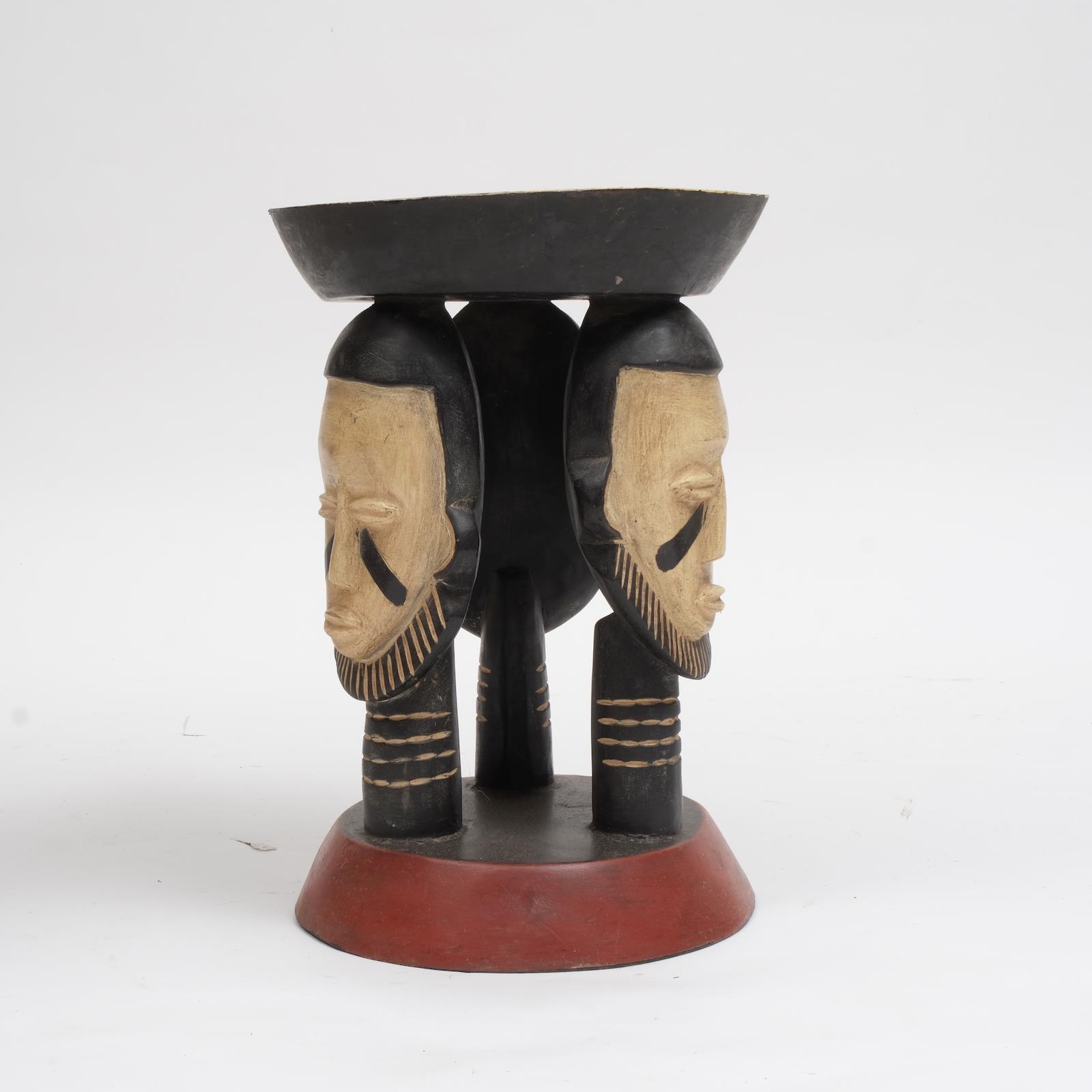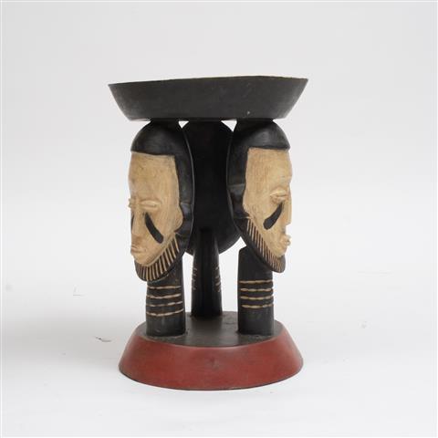 Üç farklı yüz figürüyle tasarlanan bu eser, toplulukların “çok yüzlü bilgelik” anlayışını yansıtır. Baule ve Yoruba kültürlerinde benzer objeler, adak sunumlarında ya da ruhani törenlerde kullanılmıştır. El işçiliğinin zarif detayları, siyah-beyaz kontrastı ve kırmızı kaidesiyle hem sanatsal hem de kültürel açıdan koleksiyon değeri taşır.