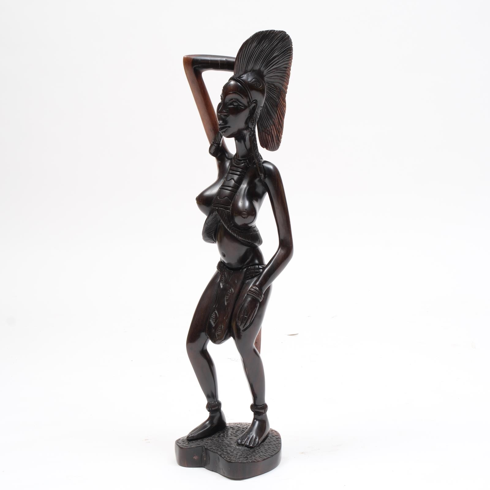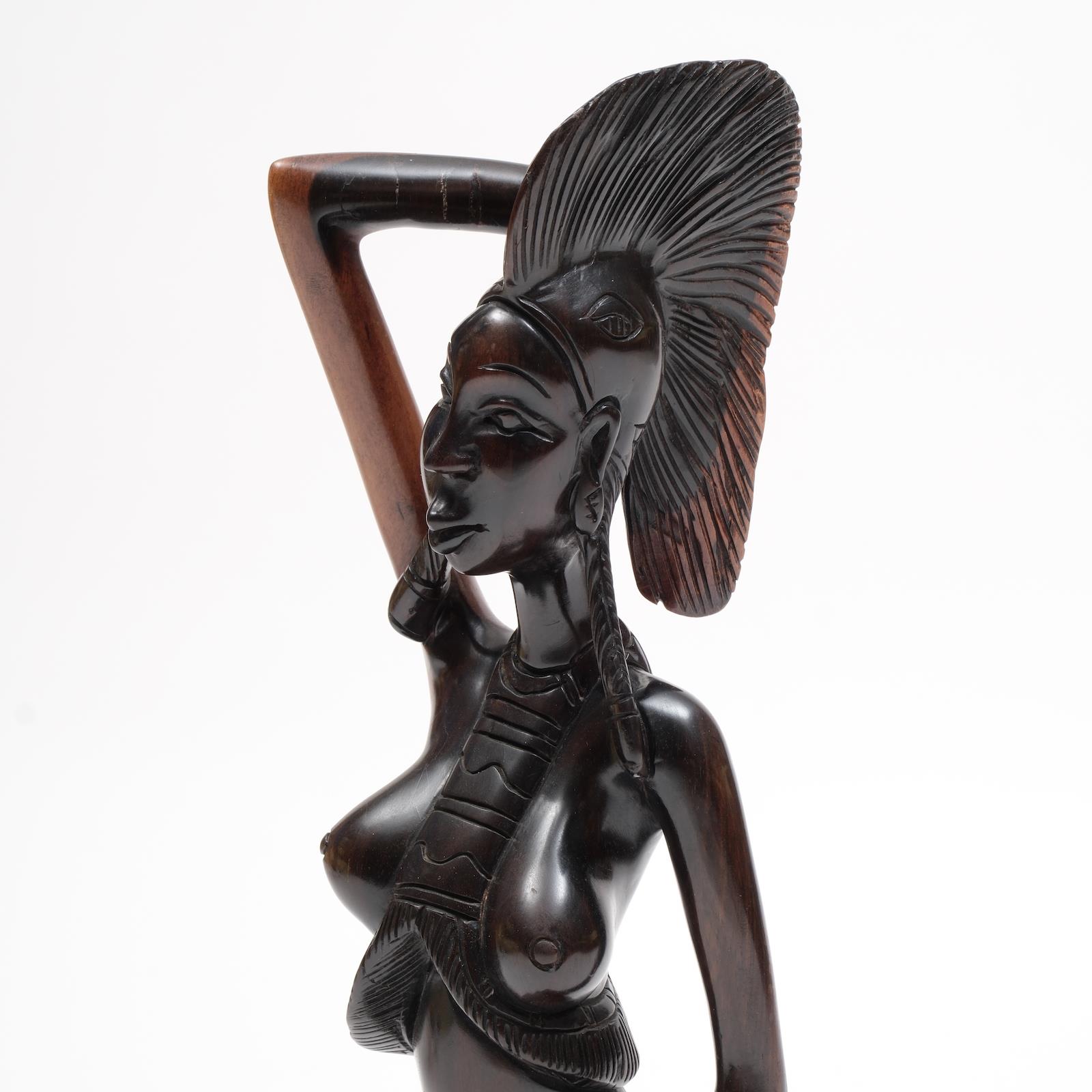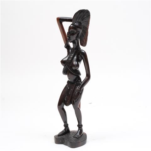 El işçiliğiyle abanoz ağacından oyulmuş bu kadın heykeli, Afrika toplumlarında kadının zarafetini, üretkenliğini ve gücünü temsil eder. Geleneksel saç modeli, detaylı takı süslemeleri ve bedenin oranları, Batı Afrika kültürünün estetik idealine atıfta bulunur.