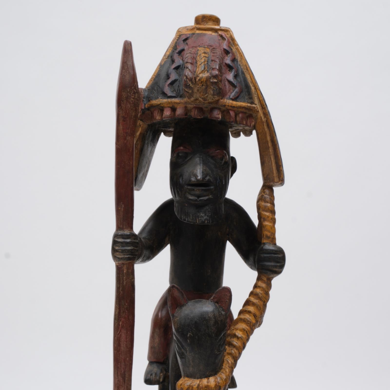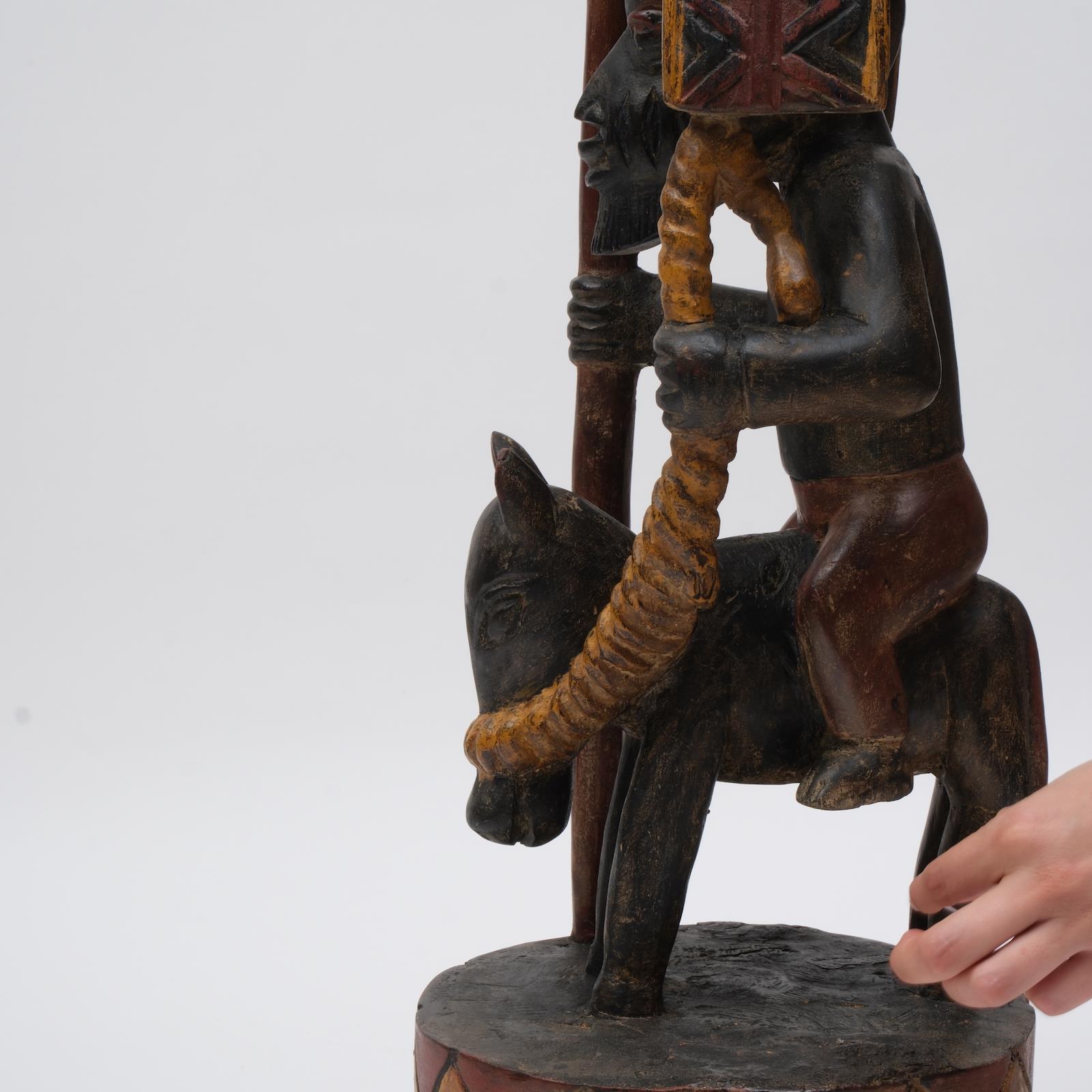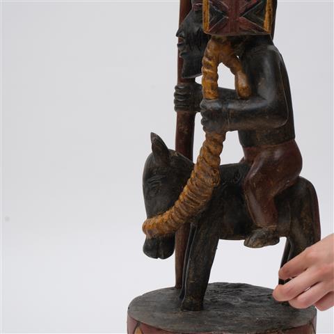 Form: Ahşaptan el oyma; başlık, mızrak ve at detaylarıyla bütünleştirilmiştir.