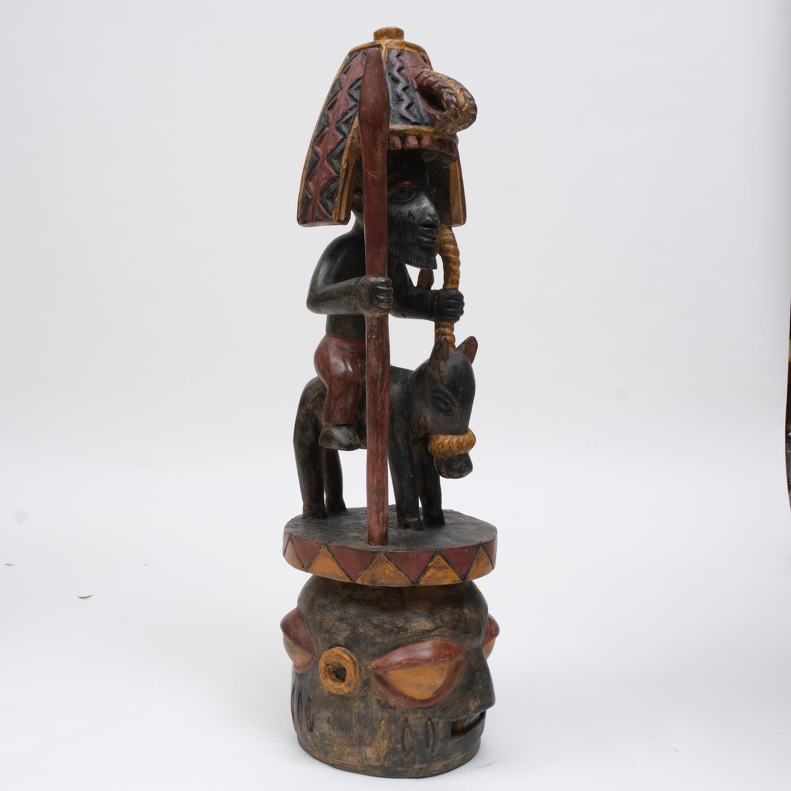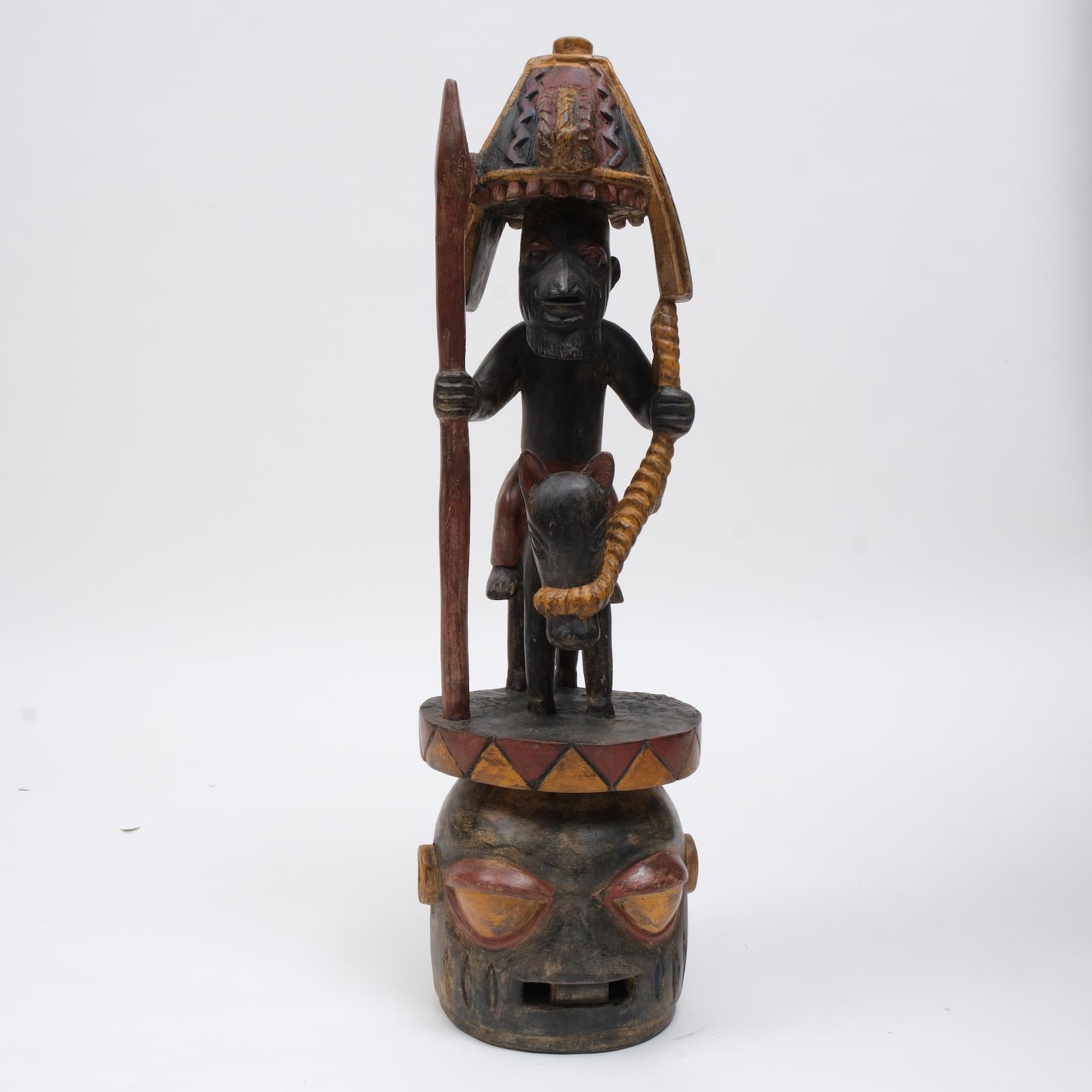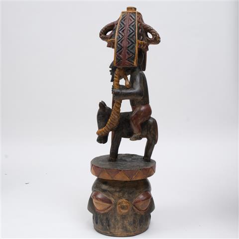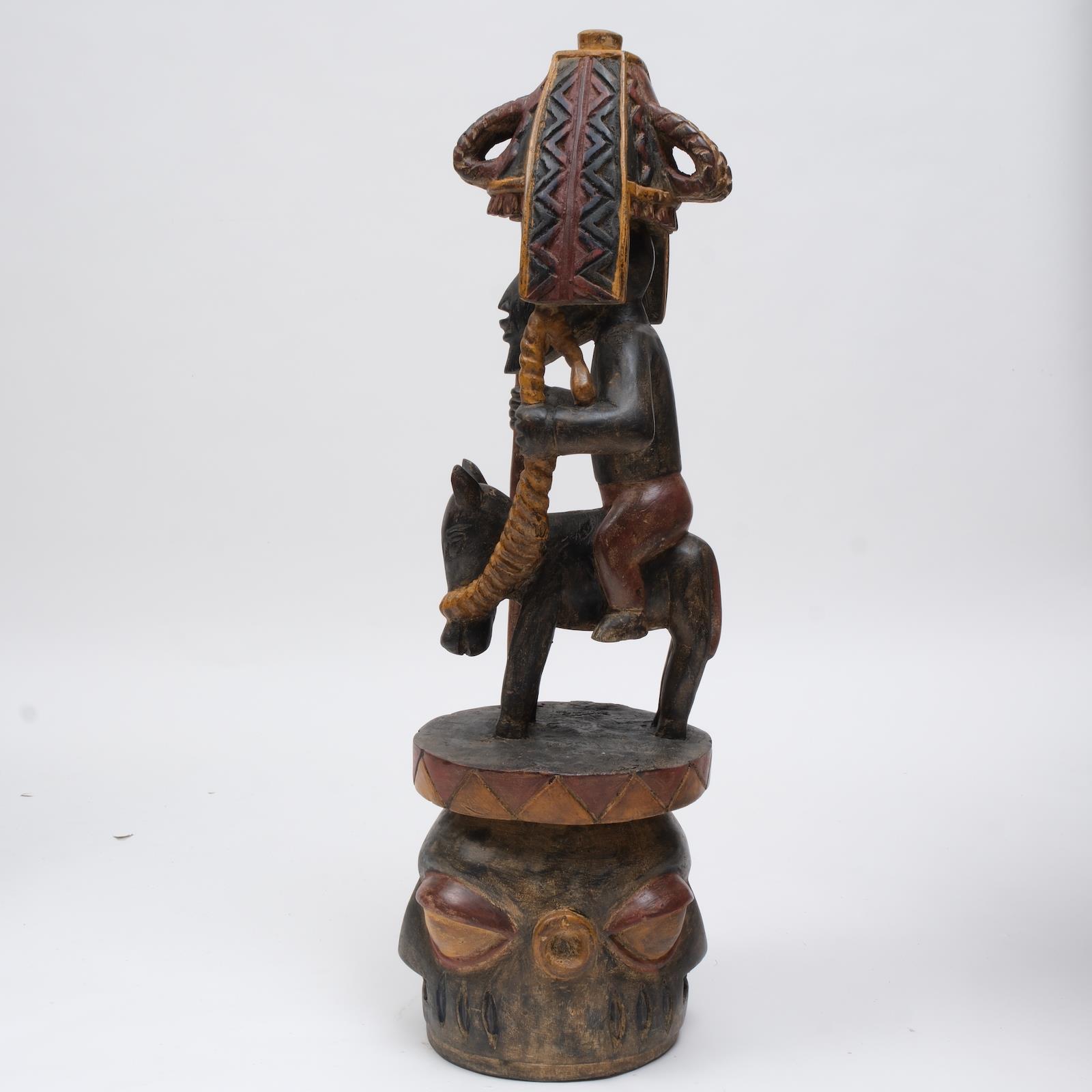 Form: Ahşaptan el oyma; başlık, mızrak ve at detaylarıyla bütünleştirilmiştir.