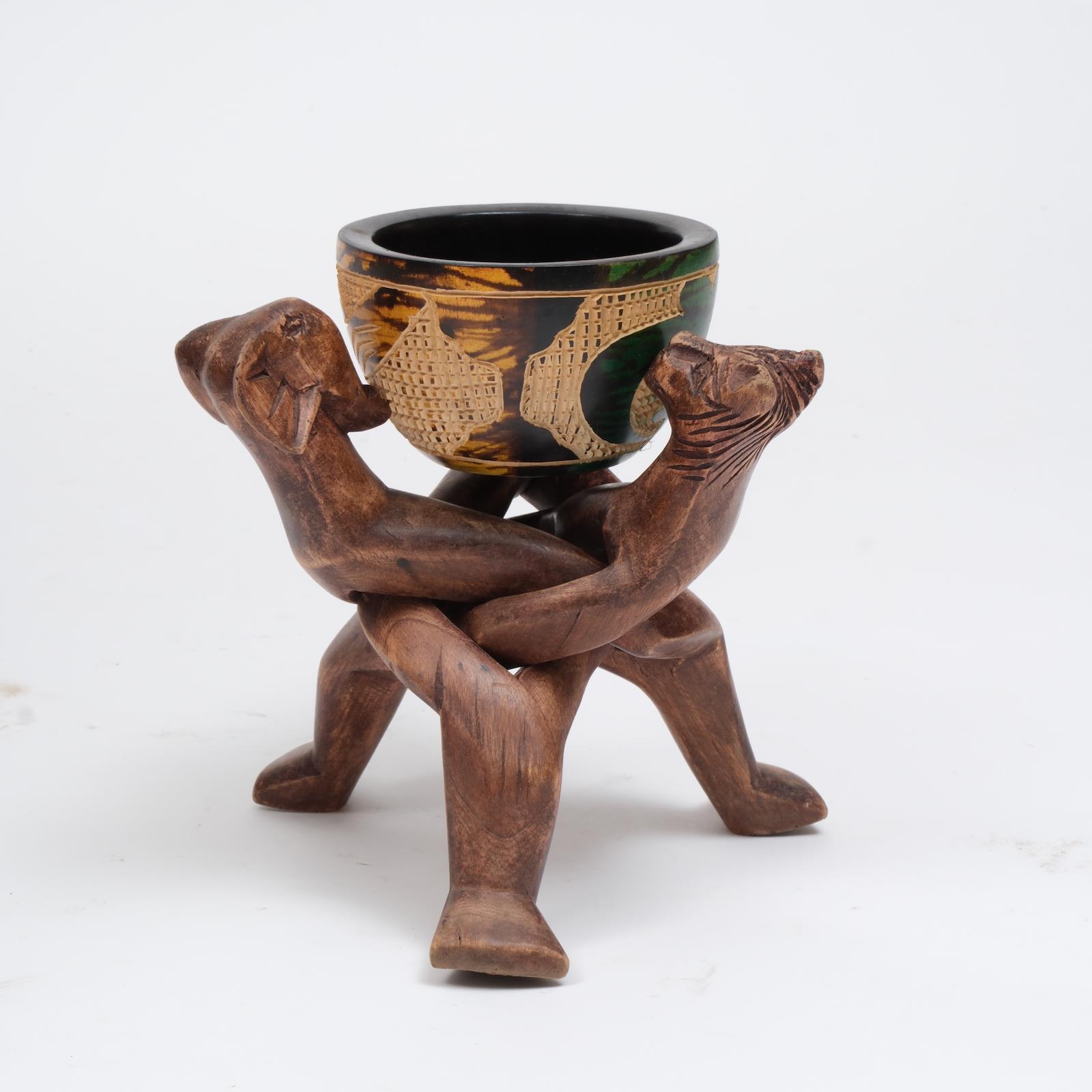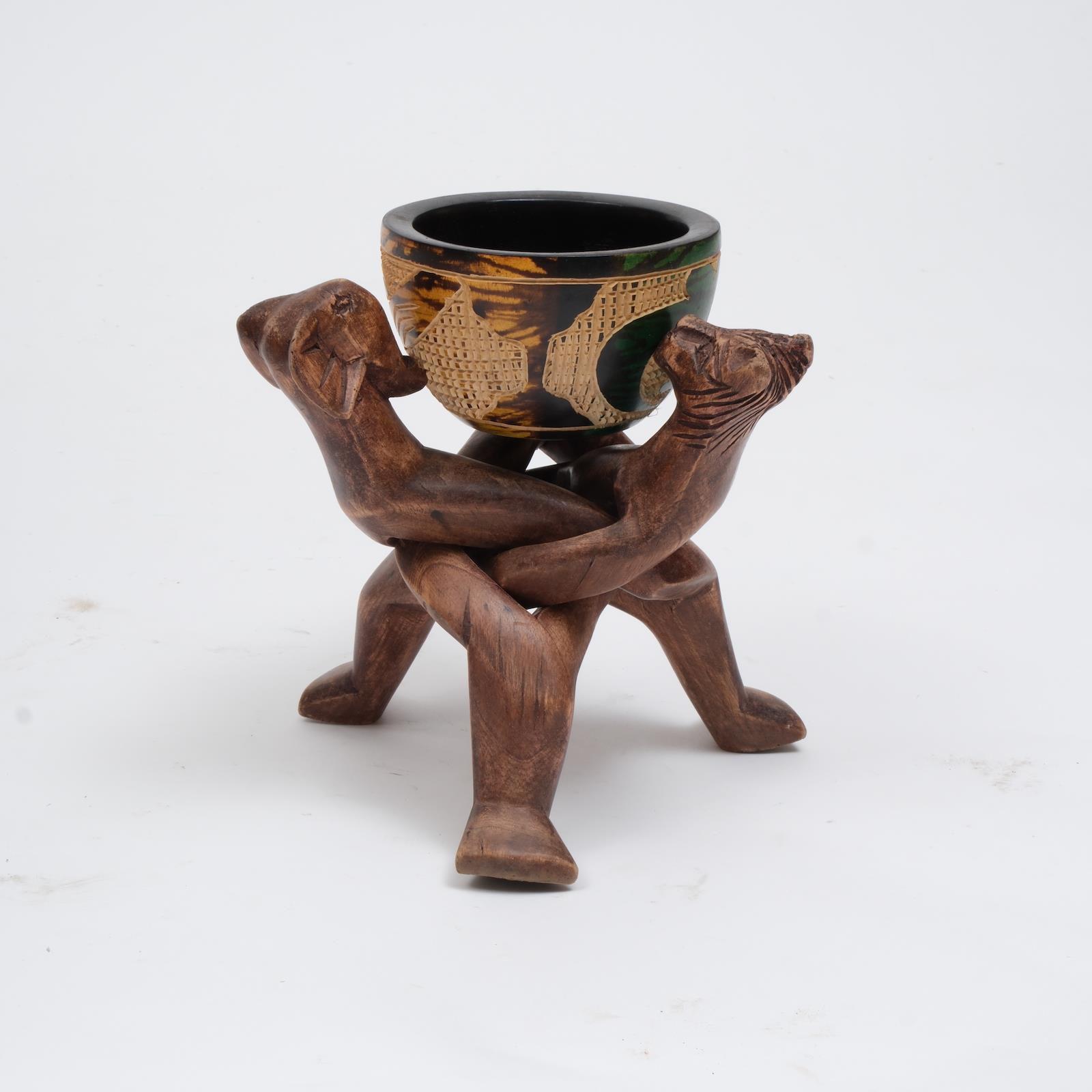 Form: Tek blok ahşaptan oyulmuş; kollarıyla birbirine kenetlenen çoklu figürlerden oluşur.