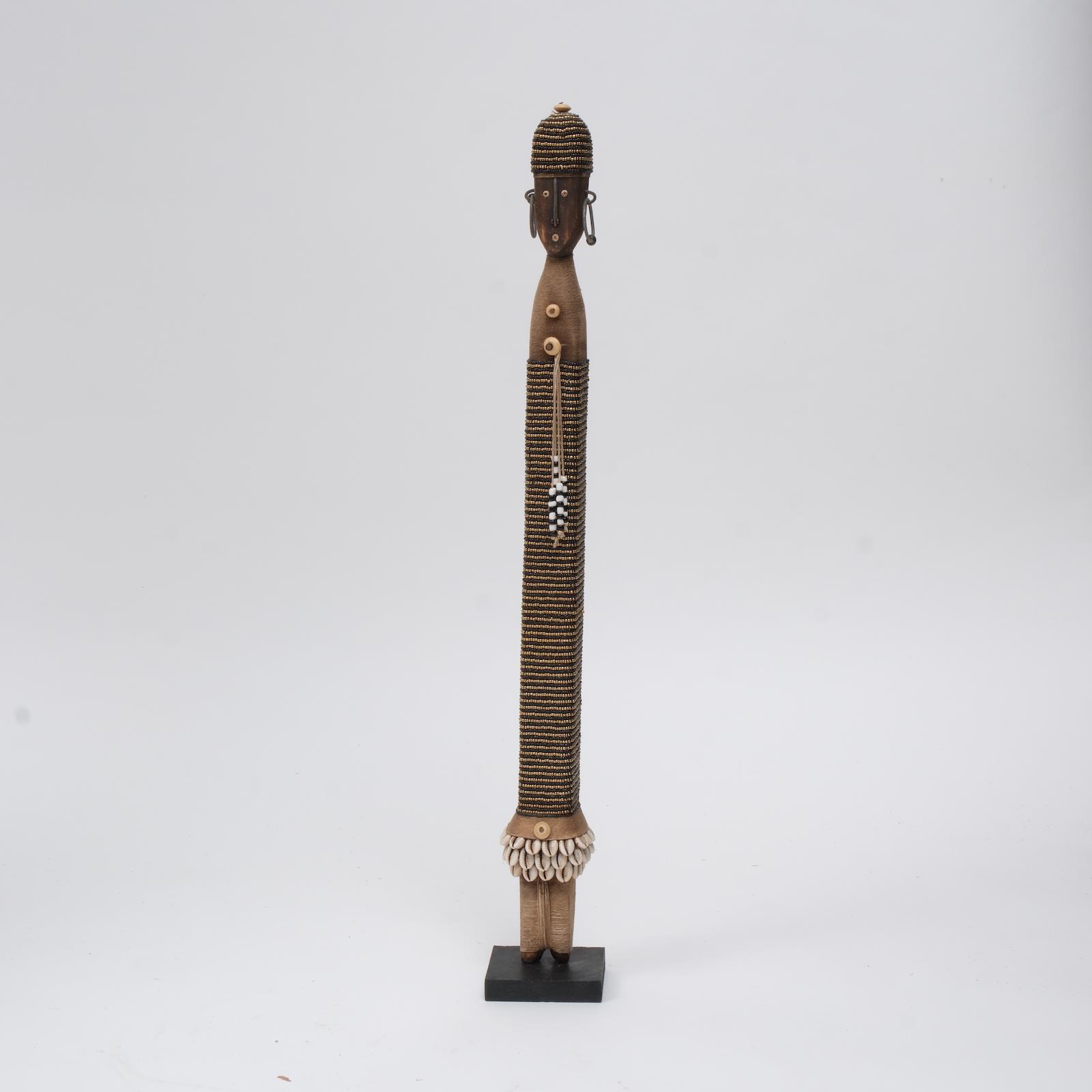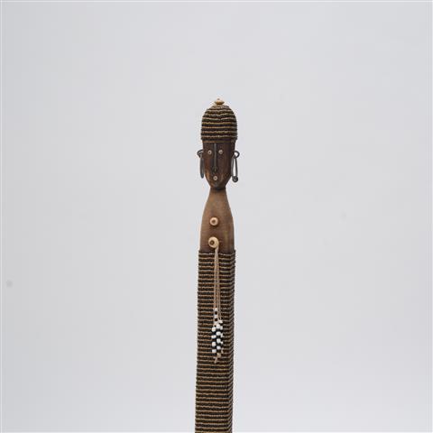 Form: Ahşap gövde üzerine boncuk işçiliği; deniz kabuklarıyla süslenmiş.