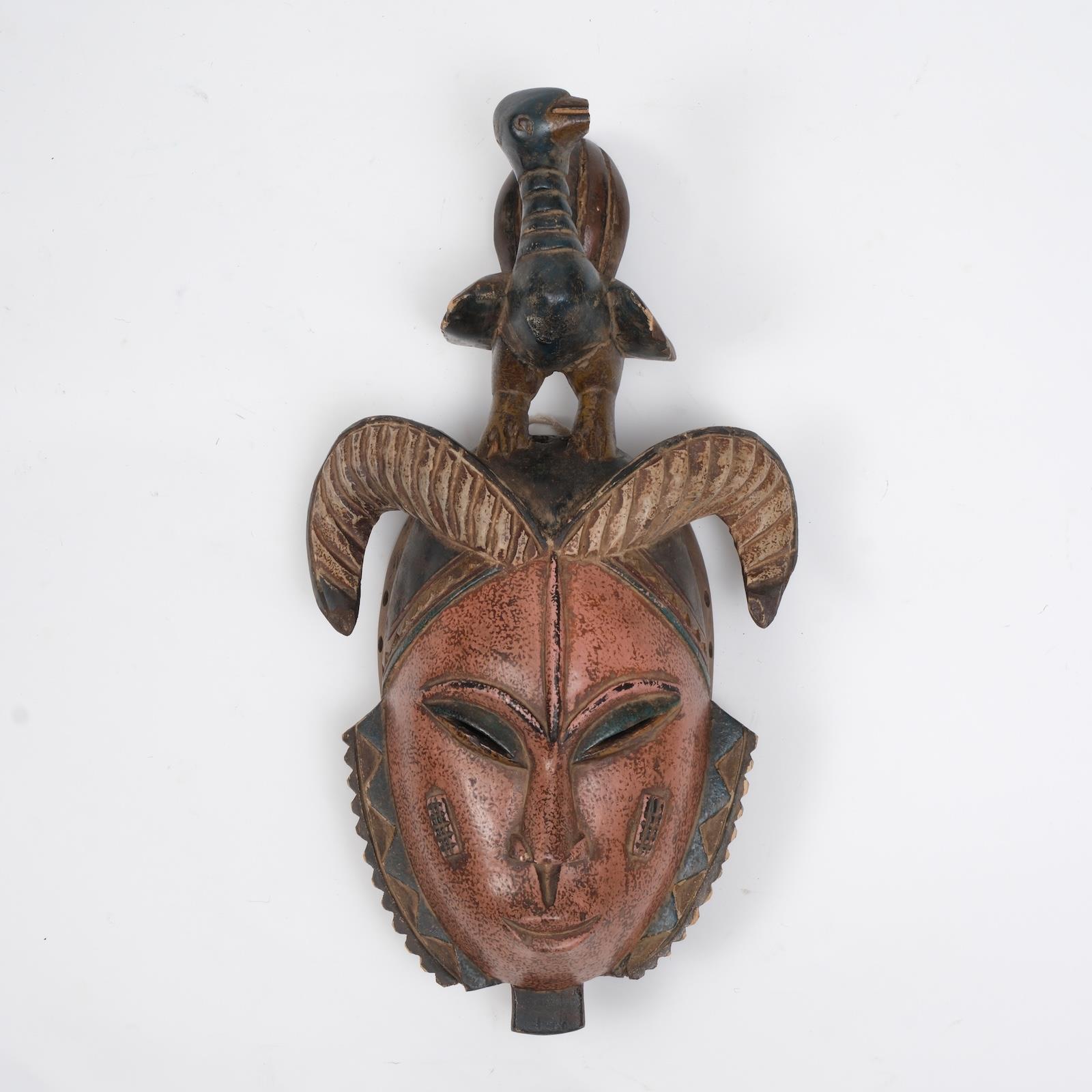 Heybetli boynuzları ve üst figürüyle bu maske, liderlik ve ruhsal muhafızlık temasını taşır. El oyma ahşap üzerine doğal pigmentlerle renklendirilmiştir. Üst kısmındaki figür, insan ile hayvan ruhu arasındaki dengeyi simgeler. Güçlü formu sayesinde mekânda odak noktası yaratır.