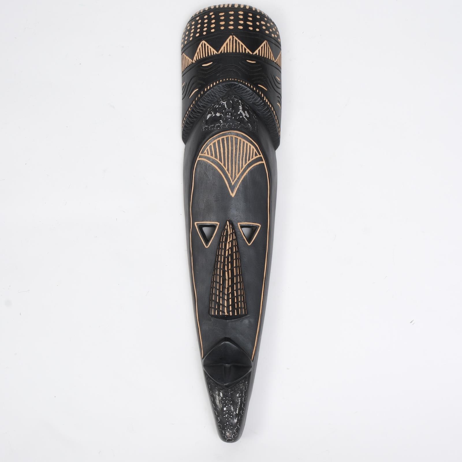 Mat siyah zemin üzerine sıcak altın tonlu oyma detaylar, bu maskeyi çağdaş bir heykel estetiğine taşır. Uzun formu ve keskin geometrik oranları, Batı Afrika’da bilgelik ve gece ritüelleriyle ilişkilendirilir. Mekânda güçlü bir dikey etki yaratarak adeta mimari bir unsur gibi algılanır.