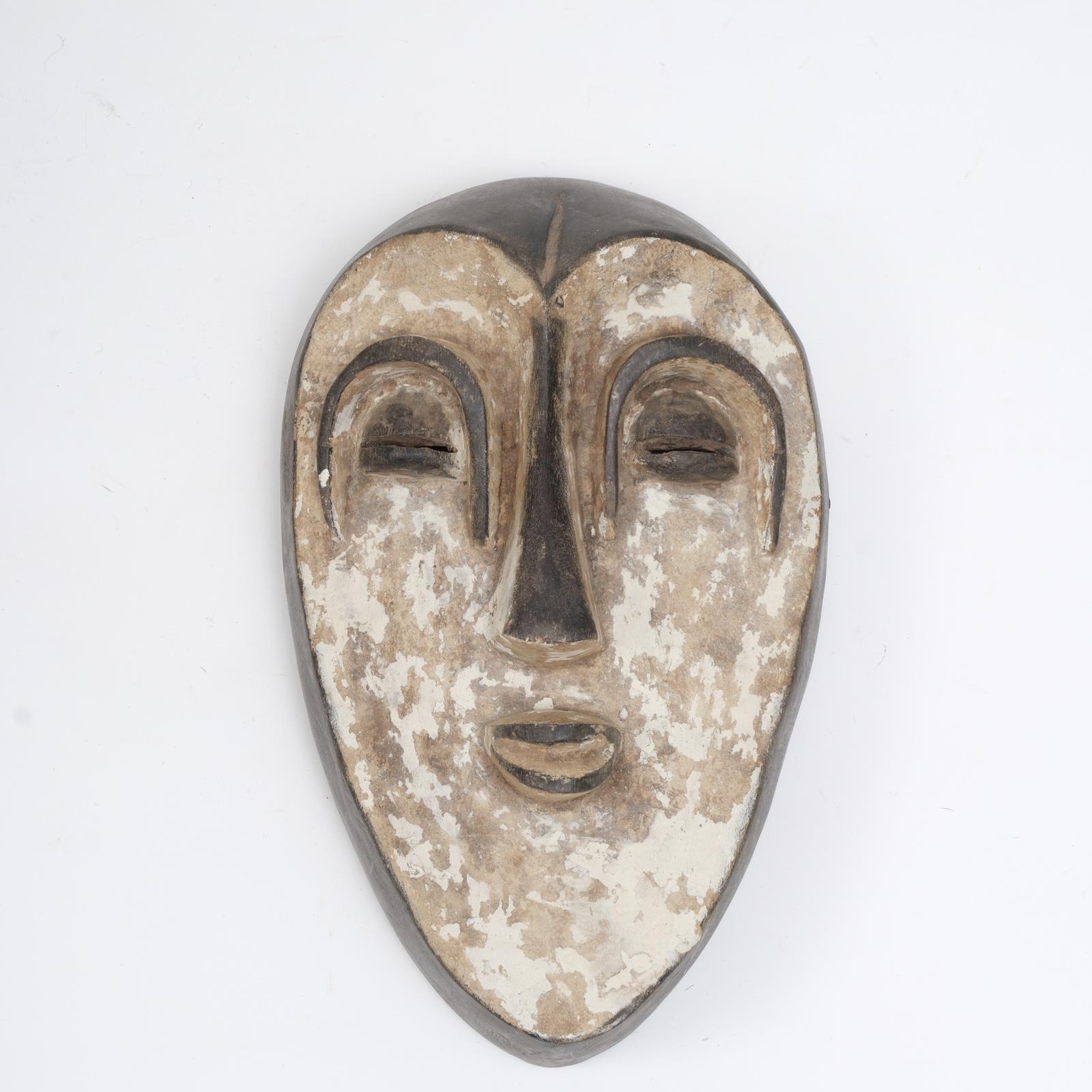 El oyma ahşap üzerine doğal pigmentlerle oluşturulmuş bu Afrika maskesi, sade formu ve açık ton yüzeyiyle dikkat çeker.