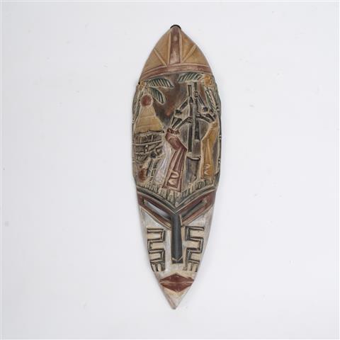 El oyma ahşaptan üretilmiş bu Afrika maskesi, yuvarlak formu ve yoğun geometrik desenleri ile dikkat çeker.