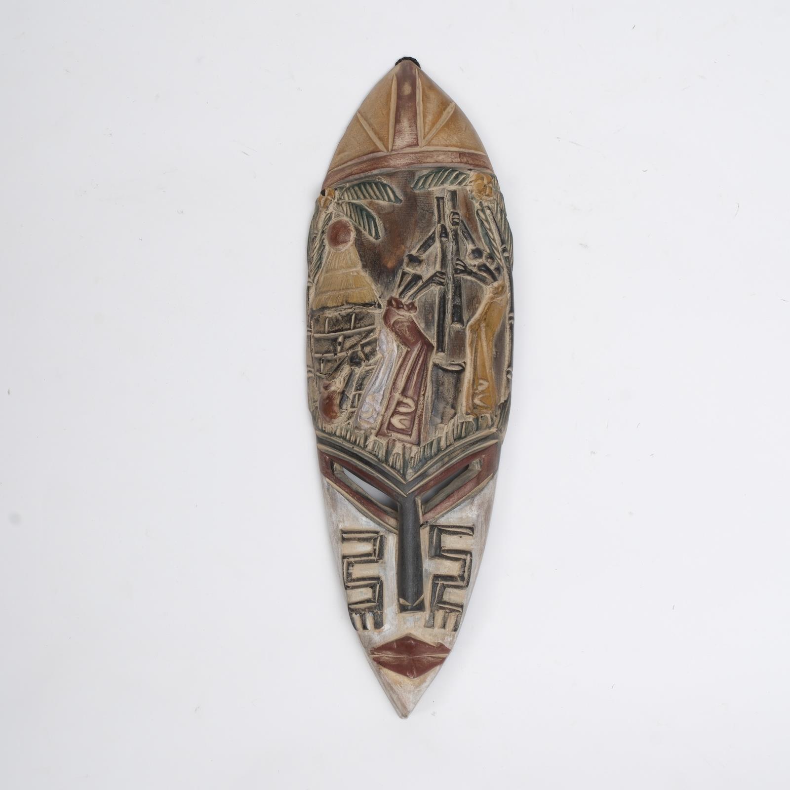 El oyma ahşaptan üretilmiş bu Afrika maskesi, yüz formunun üst kısmında yer alan kabartma sahne ile dikkat çeker.
