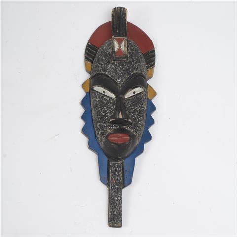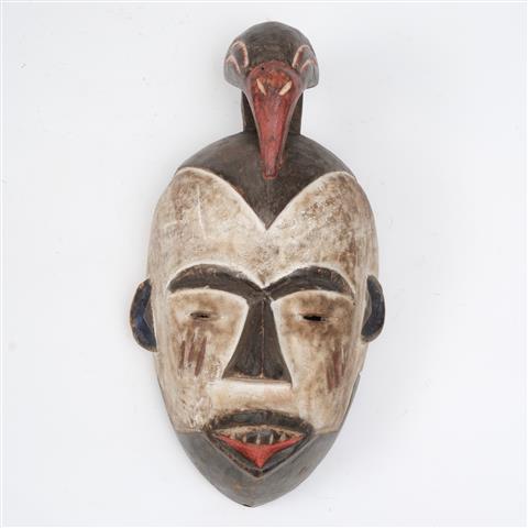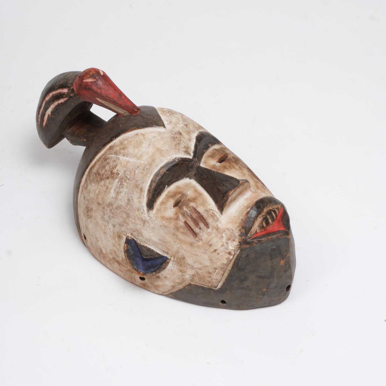 El oyma ahşaptan üretilmiş bu Afrika maskesi, üst kısmında yer alan kuş figürü ile dikkat çeker.