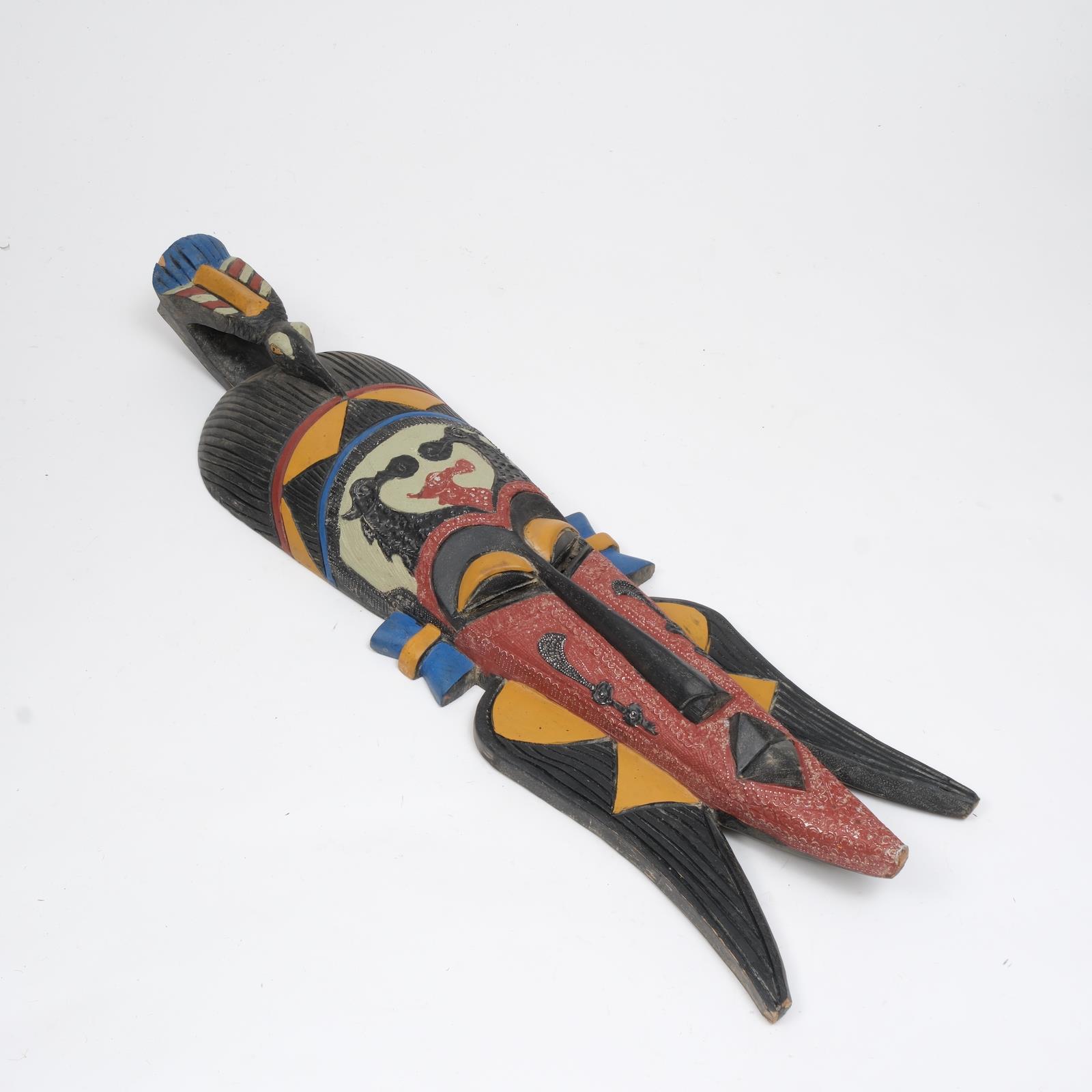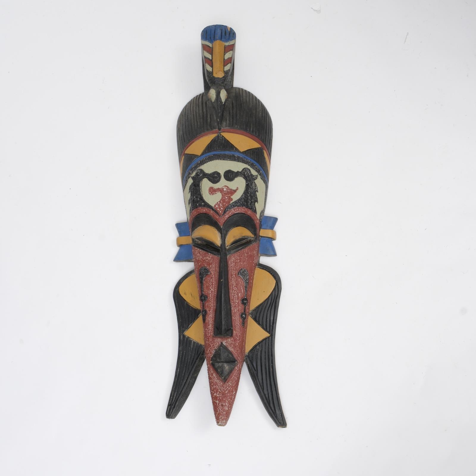 Canlı renkler ve detaylı boyama ile hazırlanmış bu maske, klasik Afrika formunu modern bir enerjiyle sunar.